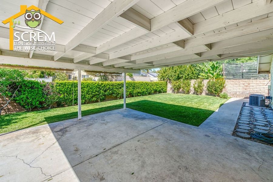 Lovely Valencia home with great curb appeal and nicely landscaped yard. The entryway opens into a spacious living room with vaulted ceilings, ceiling fans, brick fireplace, wood laminate flooring, and a sliding glass door leading to a large backyard with a covered patio and nice lawn. The kitchen has a stainless steel dishwasher, wood laminate flooring, and spacious dining area with a stained glass light fixture. Appliances include: dishwasher and stove. Three guest bedrooms with wood laminate flooring. One has double doors. The guest bathroom has been remodeled with ceramic tile flooring and a pedestal sink. The master bedroom features wood laminate flooring, a ceiling fan, two closets with mirrored closet doors, and a sliding glass door leading to the backyard. The attached master bathroom has been remodeled and has newer cabinetry with new sink and granite countertop, ceramic tile flooring, and designer tile in the shower. There is a vanity area with granite countertop just outside the bathroom. This home is located close to schools and a community park with a swimming pool. *Owner may consider a pet