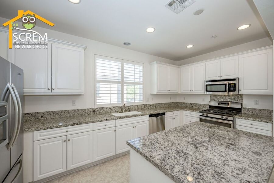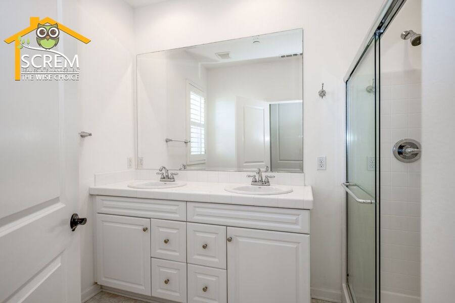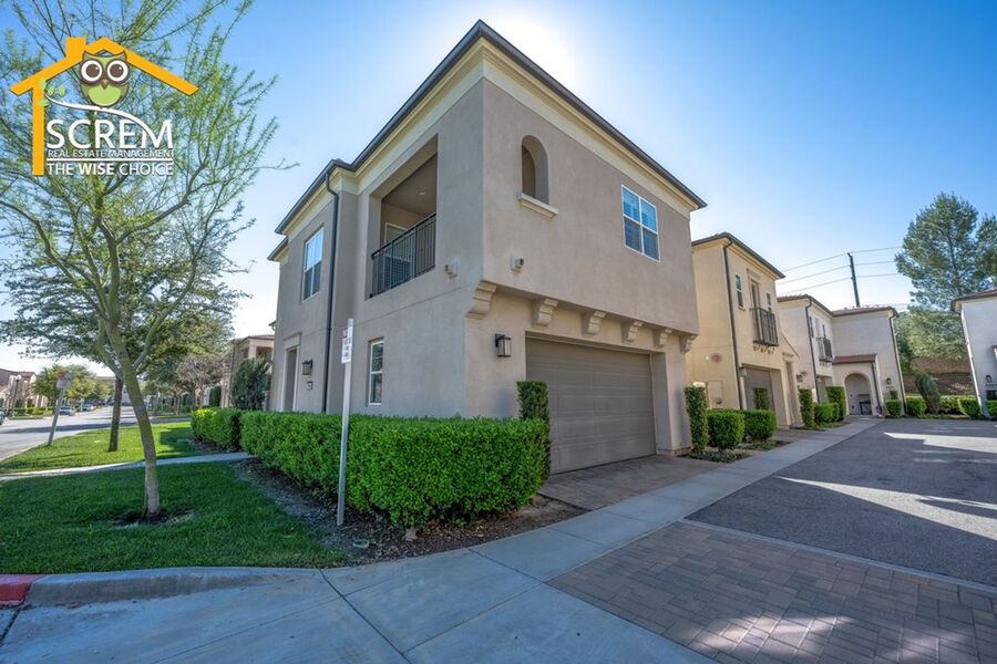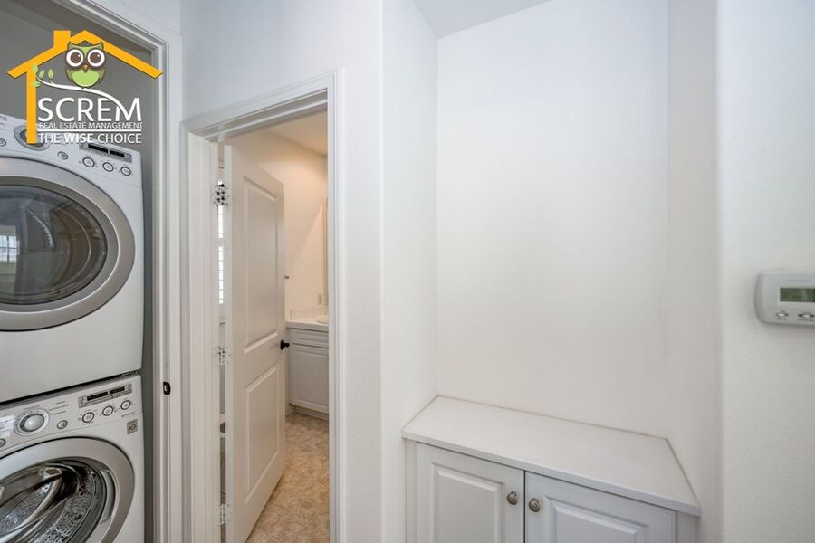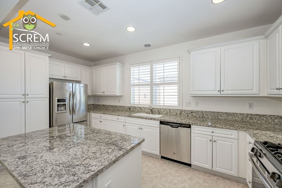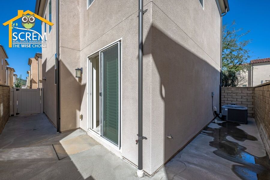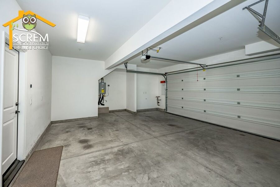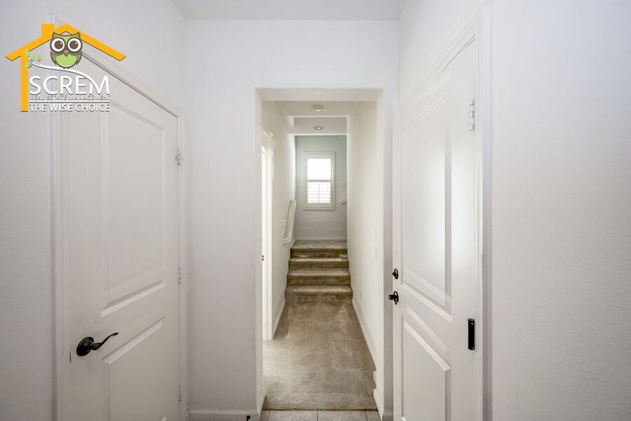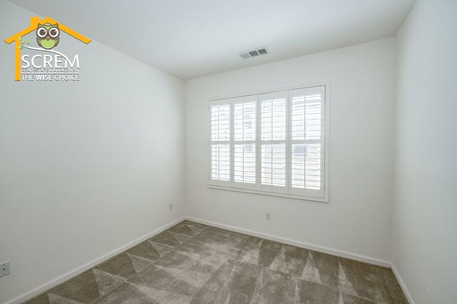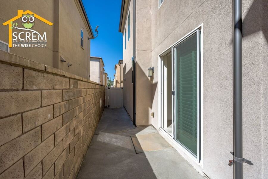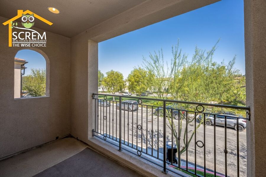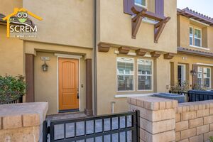 Beautiful two-bedroom, two-bathroom, two-story home located in the gated community of Villa Metro. The entrance hallway leads to a full bedroom with carpet flooring, a sliding glass door opening to a spacious patio, and an en-suite bathroom on the ground floor. As you ascend the carpeted stairs, you reach an open floor plan that includes the living room, dining area, and kitchen. The bright kitchen features a center island, granite countertops, white cabinets with brushed silver hardware, and essential stainless-steel appliances, including a gas stove, single oven, microwave, dishwasher, and refrigerator. There is a covered balcony accessible from the living area. Upstairs, you'll find another full bedroom and a full bathroom. The bathroom features dual sinks and a large walk-in shower. There is a convenient laundry closet upstairs with a stacked washer and dryer. Additional features a two-car attached garage and shutters throughout. Enjoy the resort-style community amenities, including a pool and spa, all conveniently located near restaurants and shopping. *The owner may consider a small pet.
