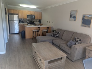 Beautiful remodeled suite. This price is for a Month to Month lease. Upgrades include stainless steel appliances, granite countertops, white kitchen cabinets, grey hardwood-style floor, gorgeous tile backsplash, under-cabinet lighting, crown molding, stainless ceiling fan with remote, new fixtures and other fine details.