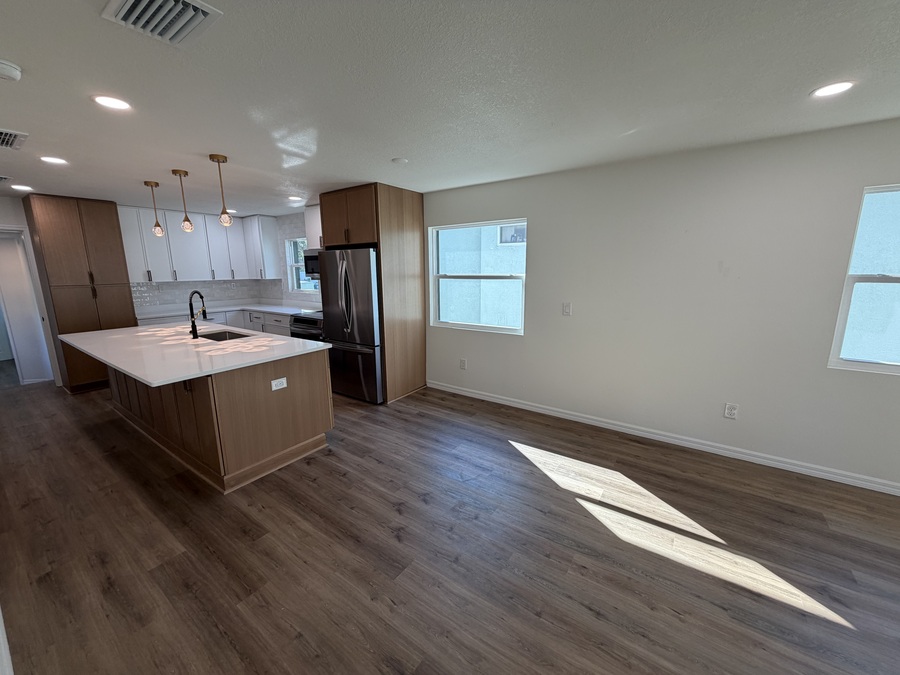 Premium Flooring: Durable and attractive honey brown Luxury Vinyl Plank (LVP) flooring throughout for a cohesive and high-end look.
