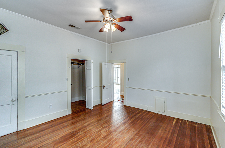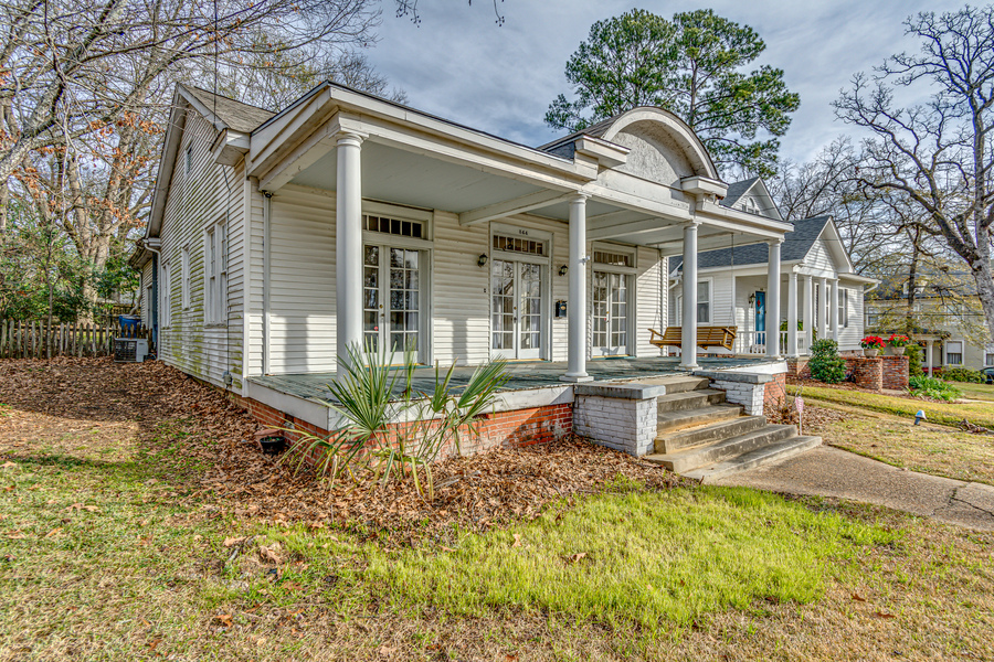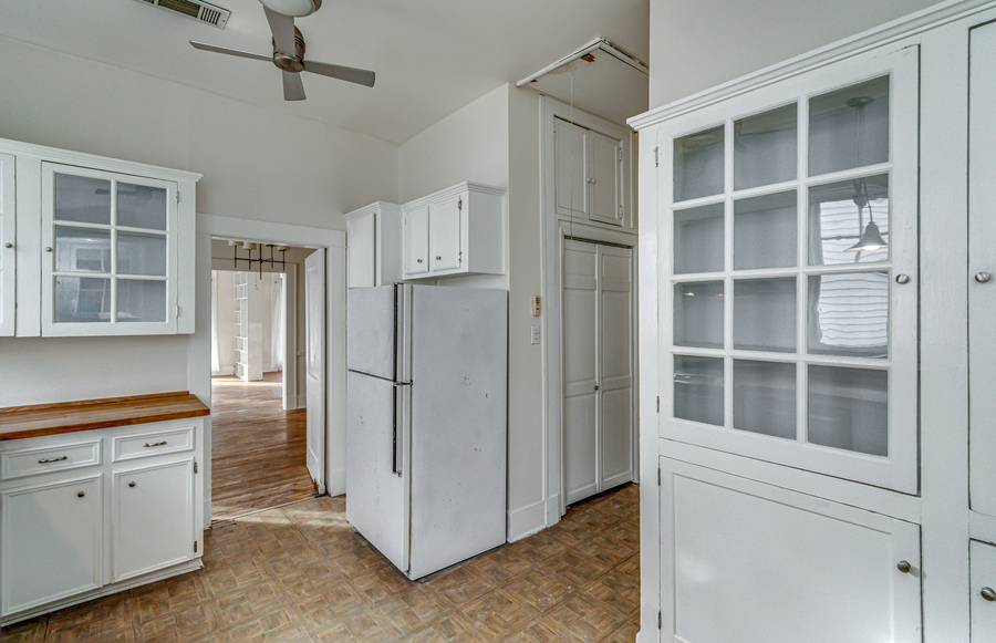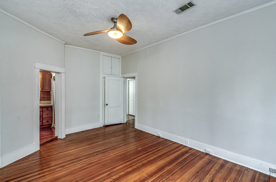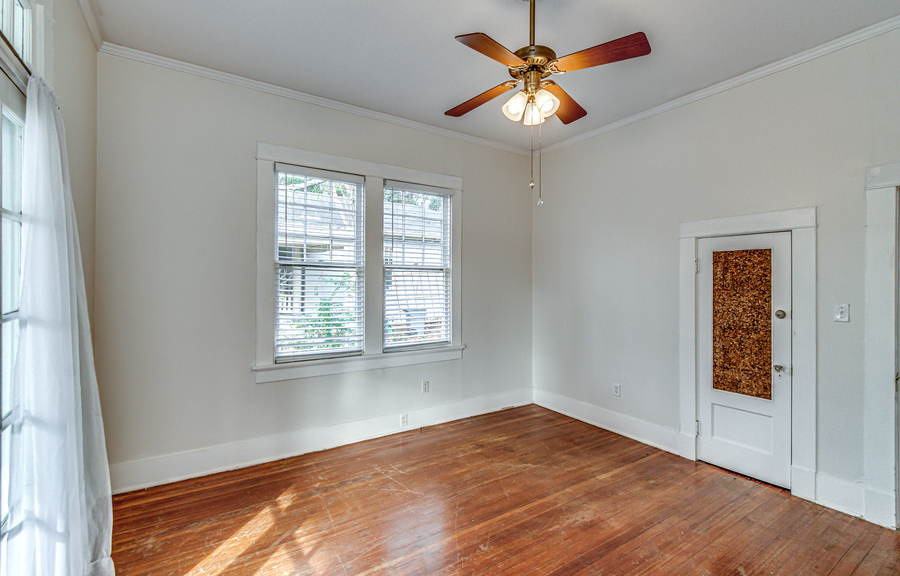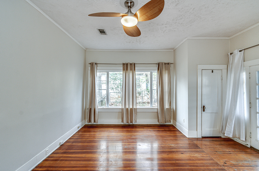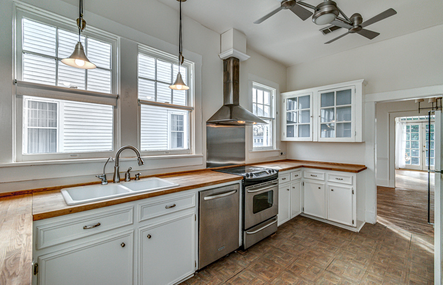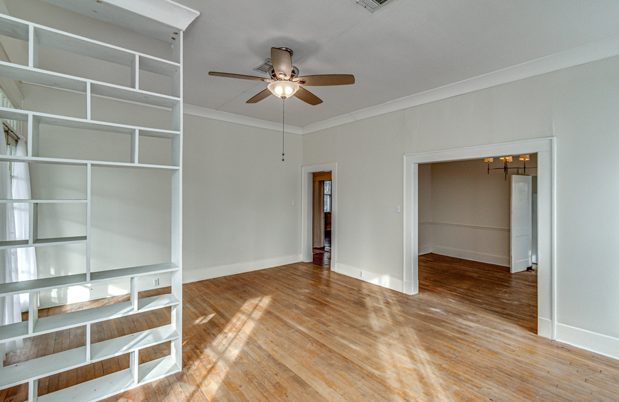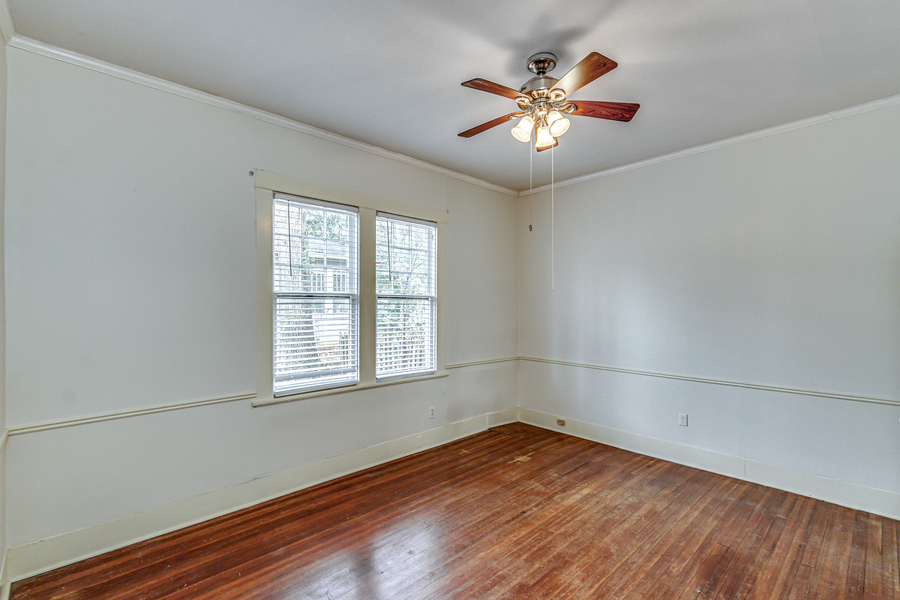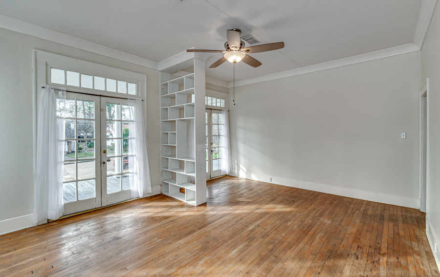 Live in a piece of Jackson’s history when you rent this 3 bedroom, 2 bath, 1828 sq. ft. home in Belhaven. This home was built by one of the descendants of the first settlers of Jackson and it has maintained much of that original 1923 character. This home has 11 foot ceilings, gorgeous wood floors throughout, and three sets of French doors along the front of the house that open out onto the large covered front porch. The living room has an open feeling with its tall ceilings and natural light and has gorgeous crown molding and marble fireplace. The living room is two-toned with white wainscoting and berry-colored walls that make the space feel intimate. The kitchen is just off the dining room and it has been updated with white cabinets, butcher-block (wood) counter tops, and has stainless steel appliances (dishwasher and stove (electric)), and has a walk-in pantry/storage area.