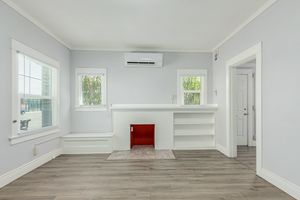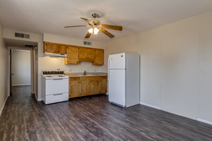 This apartment is a perfect blend of style and comfort, featuring an open floor plan with eat-in kitchen. The kitchen is equipped with modern stainless steel appliances including a refrigerator, dishwasher, microwave, and stove/oven.