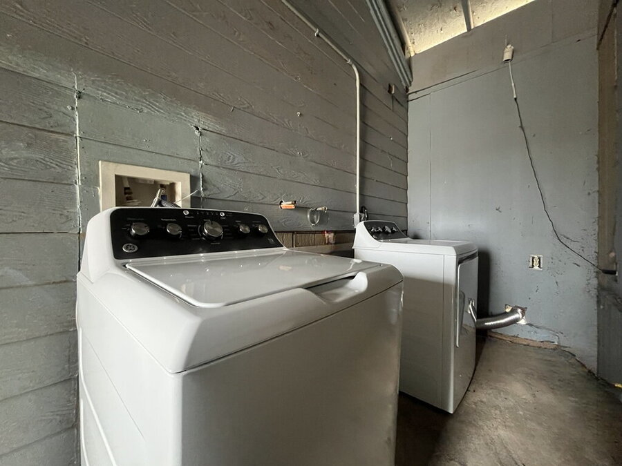The primary bedroom includes a generous walk-in closet, and the shared bathroom features a tub/shower combo and a single vanity for everyday ease. Outdoors, enjoy the natural beauty of mature trees surrounding the property, plus the convenience of two assigned parking spaces and an on-site laundry facility. Located near shopping and everyday essentials, this home offers a great balance of privacy and accessibility.