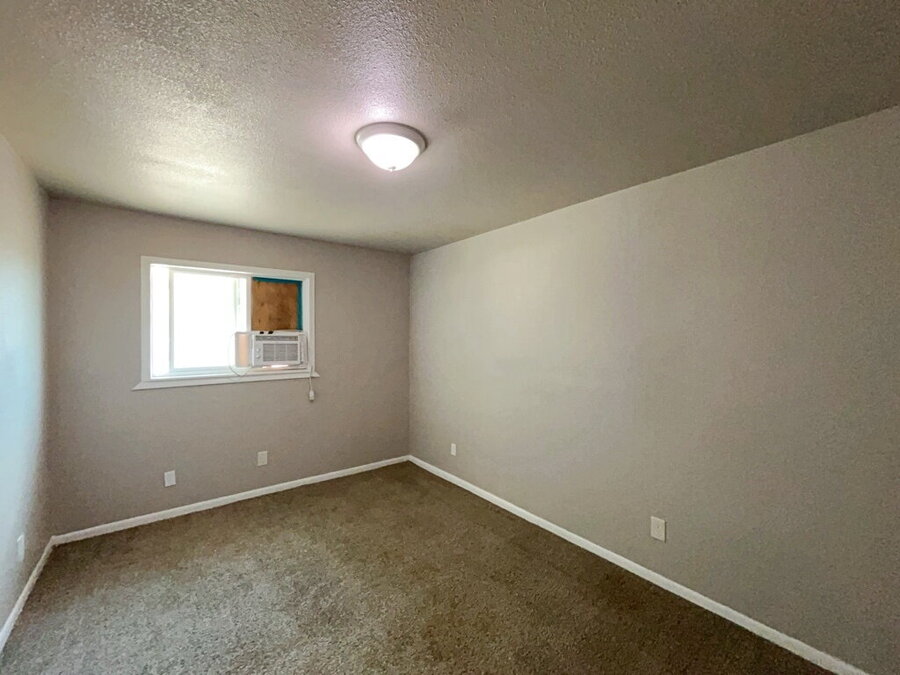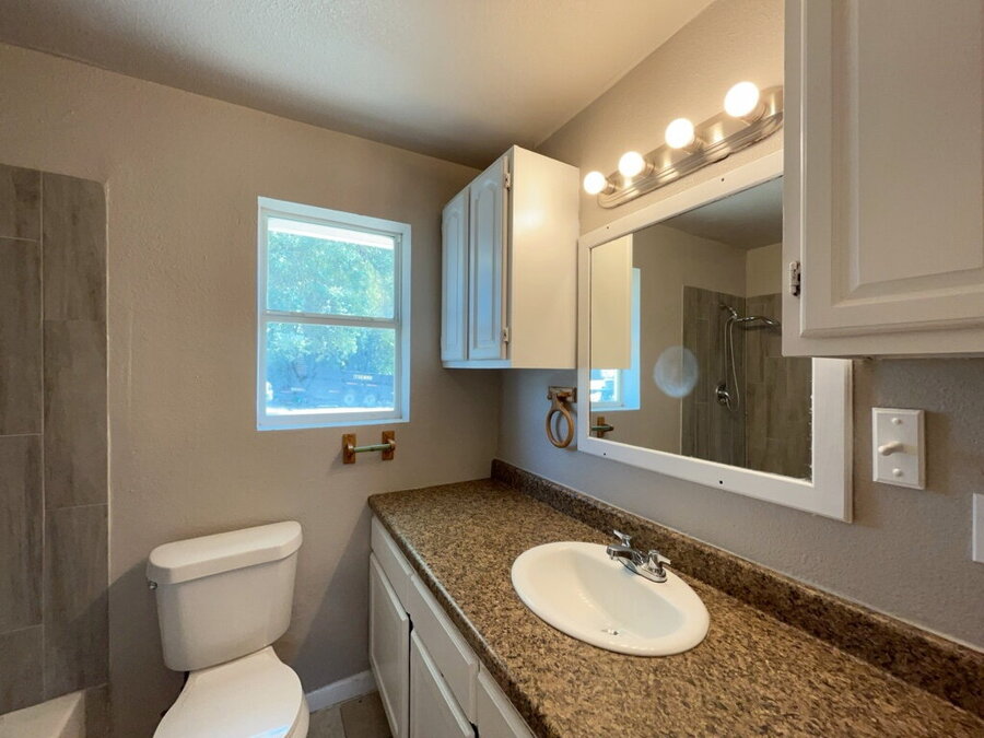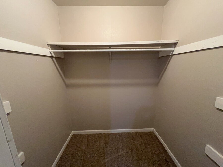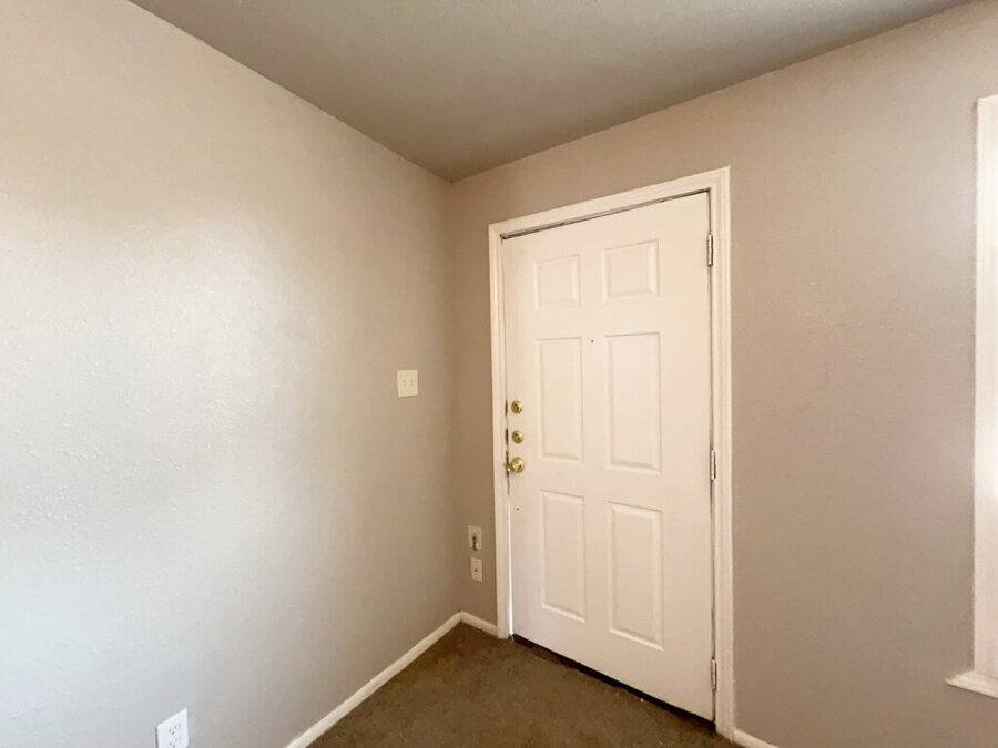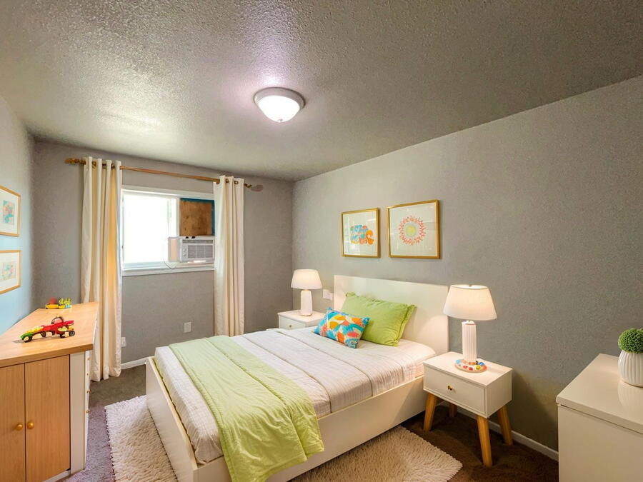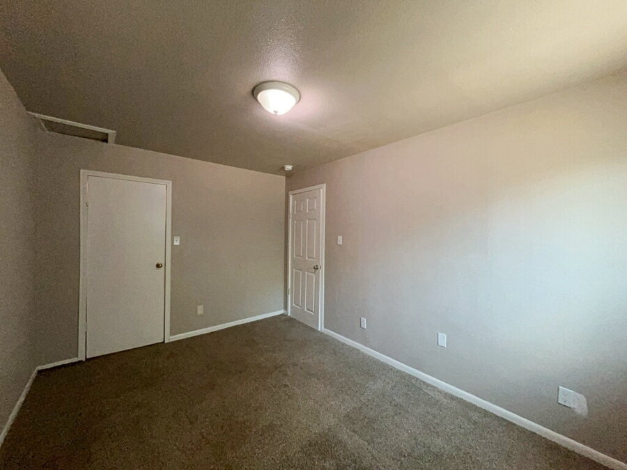 The primary bedroom includes a generous walk-in closet, and the shared bathroom features a tub/shower combo and a single vanity for everyday ease. Outdoors, enjoy the natural beauty of mature trees surrounding the property, plus the convenience of two assigned parking spaces. Located near shopping and everyday essentials, this home offers a great balance of privacy and accessibility.