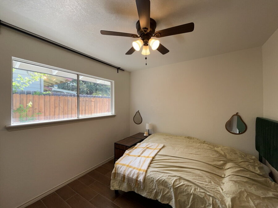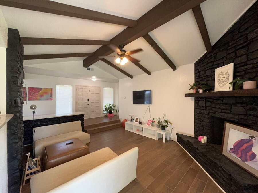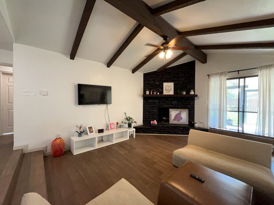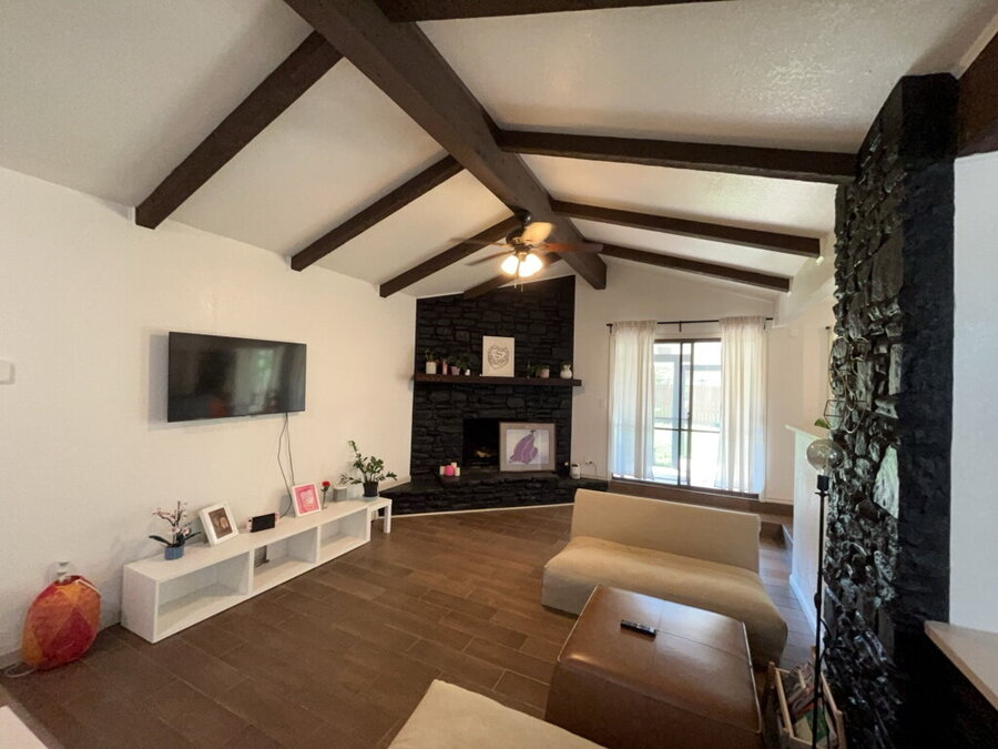 The living area features a cozy fireplace and ceiling fan, creating a perfect spot to unwind. The kitchen is equipped with solid countertops, a pantry, electric stove, microwave and refrigerator ideal for those who enjoy cooking and entertaining. A separate laundry area in the garage comes with a washer and dryer for added convenience.
