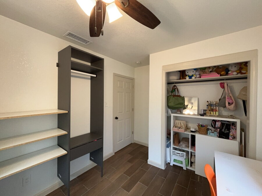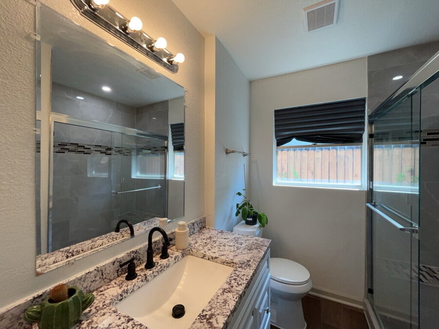 The spacious primary bedroom offers multiple closets and a private ensuite bathroom complete with a walk-in shower and single vanity. Two additional bedrooms and a second full bathroom provide plenty of flexible space for work, guests or hobbies.