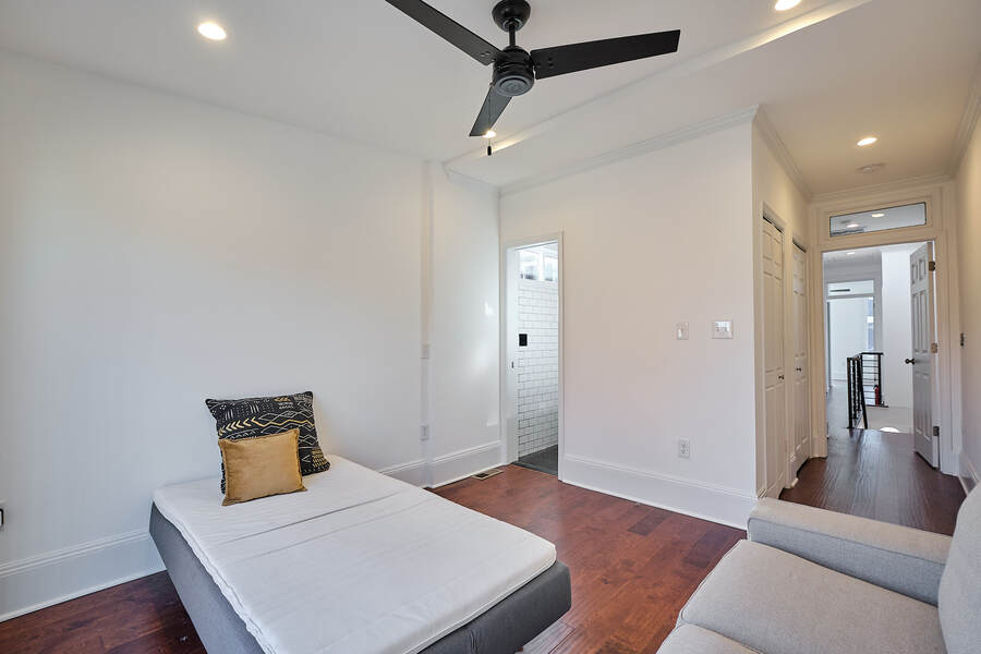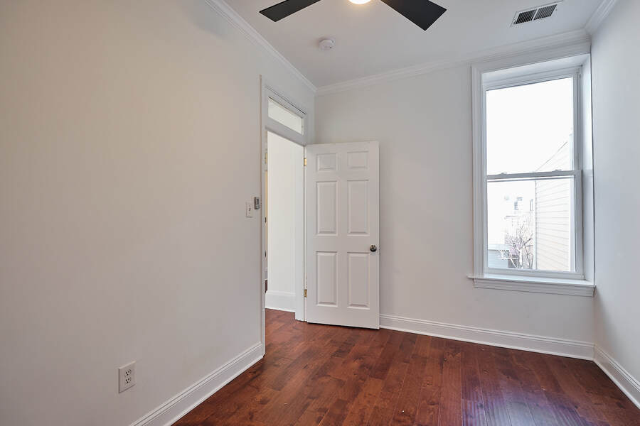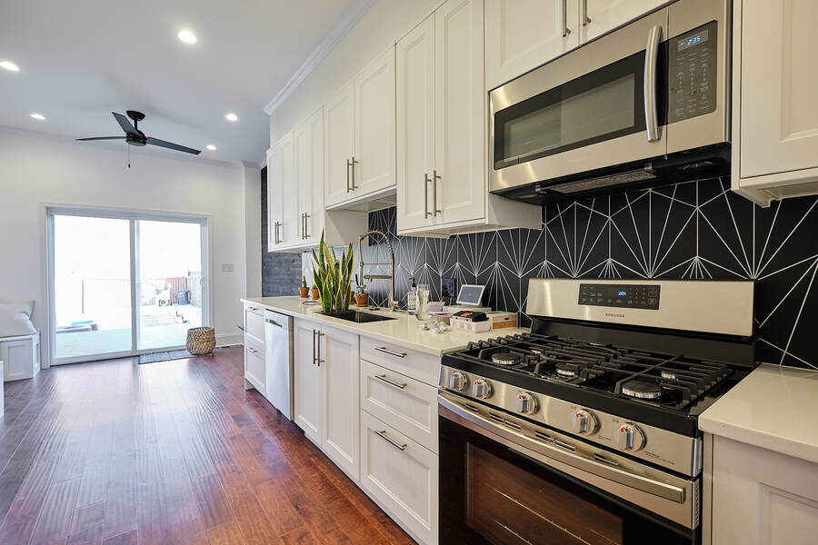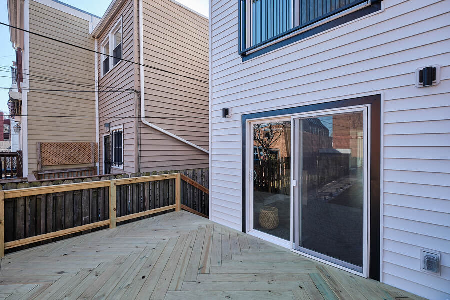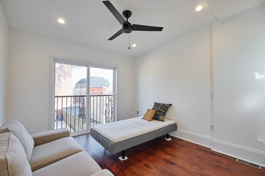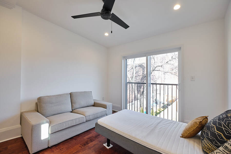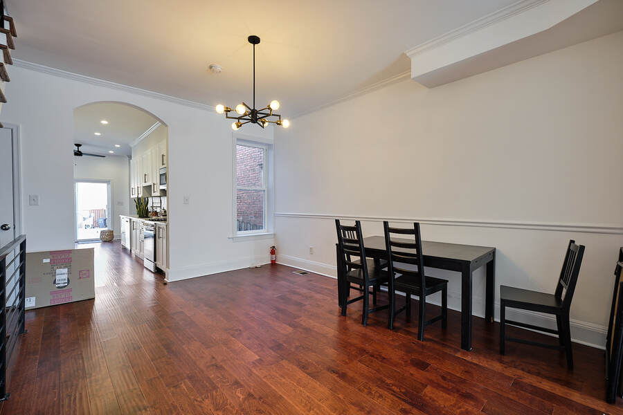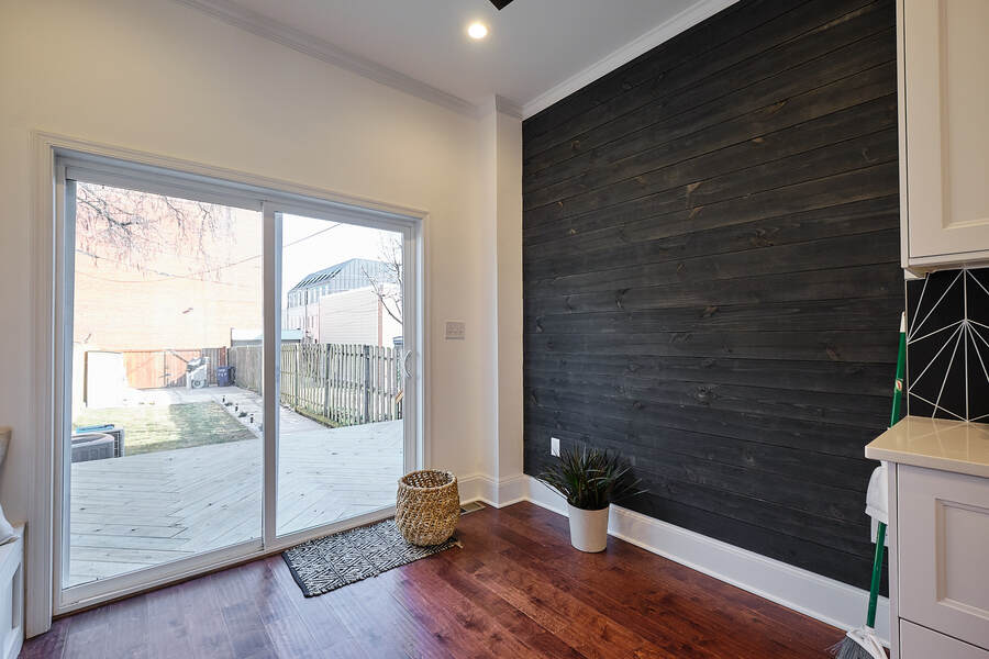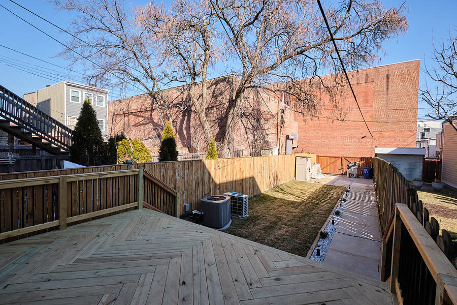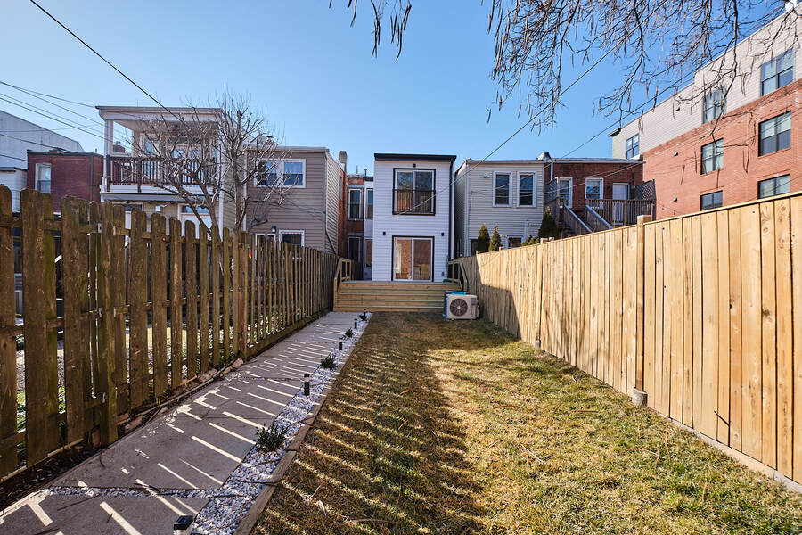 Entering this gorgeous four bedroom home you are greeted by a grand living and dining room that features beautiful hardwood floors, a decorative fireplace, large windows, a brick accent wall, and recessed lighting. Your guests will be impressed just walking through the front door! Continue through the first floor to find a half bathroom followed by your enormous chef's kitchen with high end stainless steel appliances, clean-cut white cabinets and countertops, custom backsplash, a built-in bench for seating, and a charming accent wall. Head outside to your very own deck and backyard, perfect for playing with your fury friend, hosting a barbecue, or having a romantic dinner during the summer. Your top floor showcases a total of three bedrooms and three full bathrooms. The master bedroom features tons of natural, great closet space, and a spectacular master bathroom with a beautiful vanity, modern lighting, and a subway tile shower. Head down the hall to find another modernized and fully renovated guest bathroom, a separate bedroom, and one more large bedroom which has a private bathroom with a double vanity and a Juliet balcony. Your brand new basement is the perfect place to setup a game room or convert into a family room. On this level you will find another generously sized bedroom and bathroom. There are private entrances from both the front and back yard. This home includes an in-unit washer and dryer, central air, smart home setup, and additional eco-friendly features.