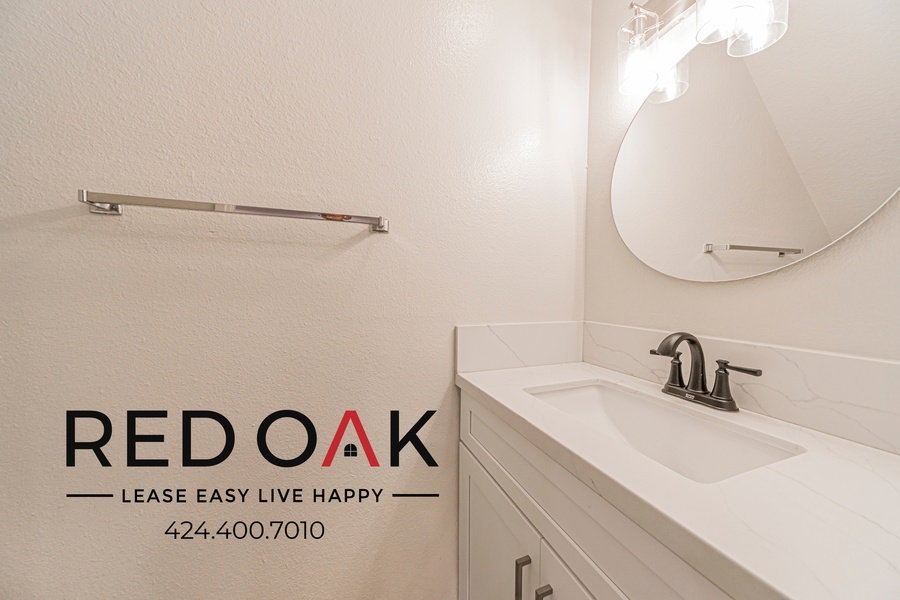 ~ Refreshing Bath: Well-lit mirror, hardwood vanity, and soaking tub, plus a convenient half bath downstairs.