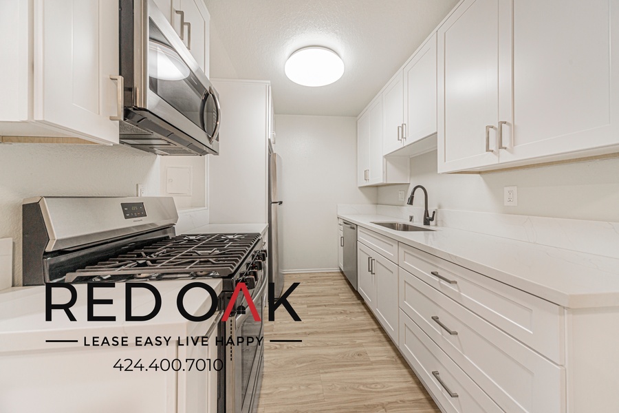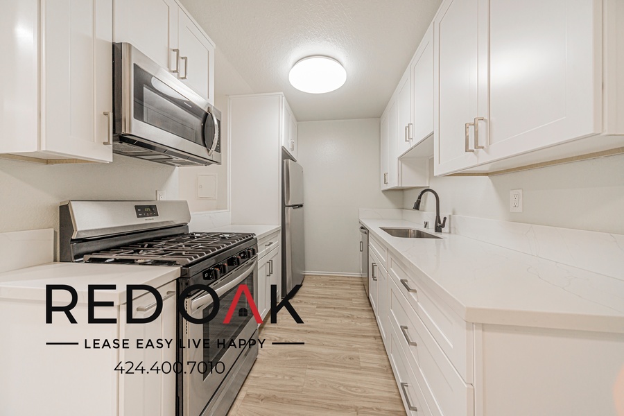 ~ Stylish Kitchen: Custom cabinets, quartz counters, and stainless steel appliances.