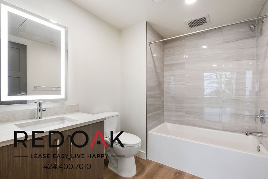 ~ Refreshing Bath: Well-lit mirror, hardwood vanity, and soaking tub.
