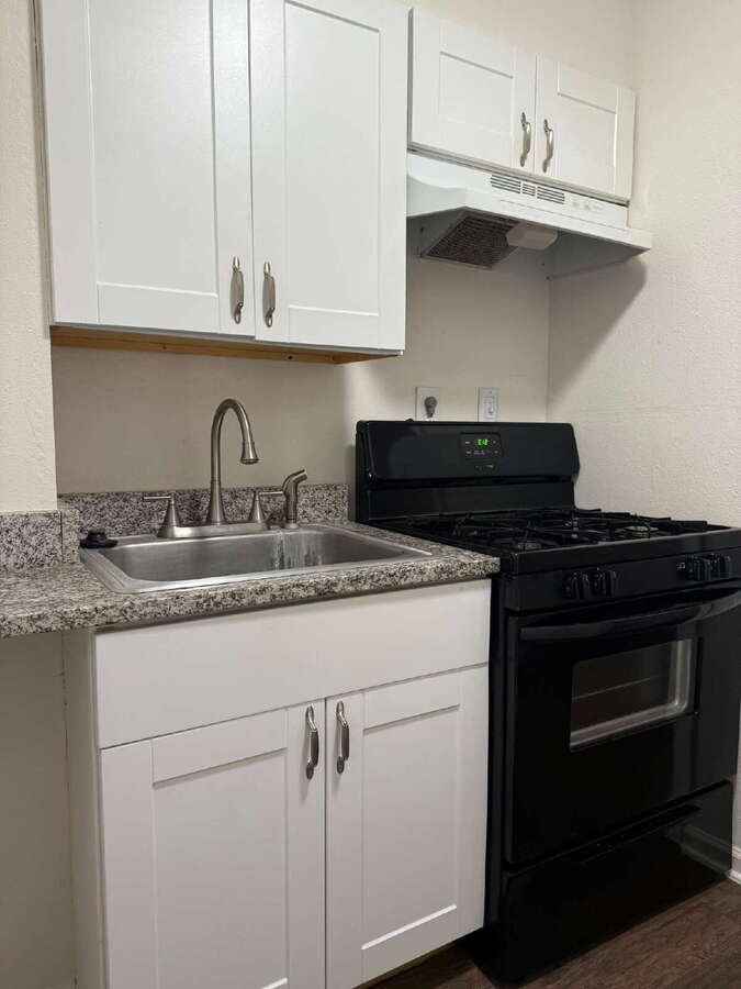This studio apartment includes a full kitchen and bathroom. The apartment has dark wood flooring throughout the interior and tile in the full bathroom. The kitchen includes over and under-sink cabinetry, a traditional oven, and refrigerator. Schedule a showing and don't forget to inquire about our flexible deposit option!