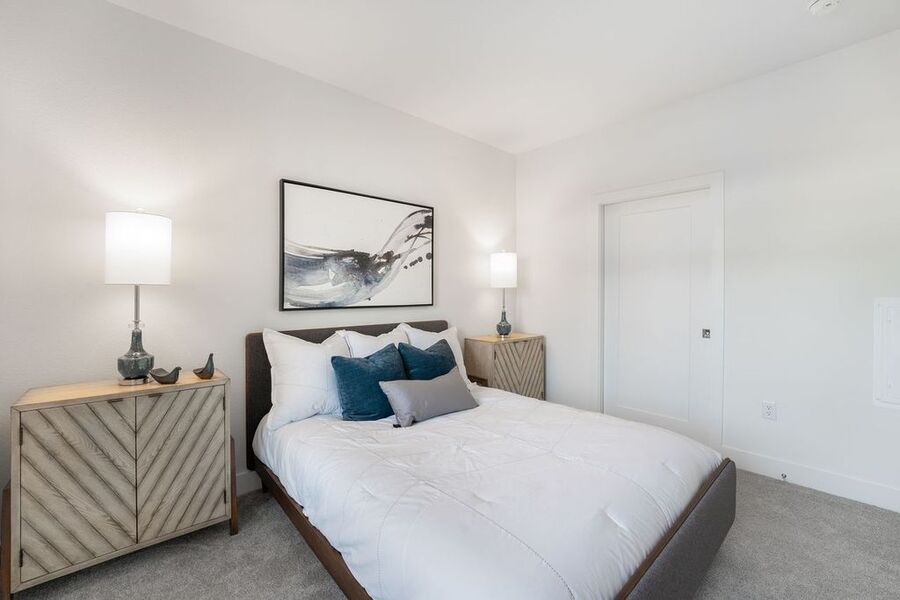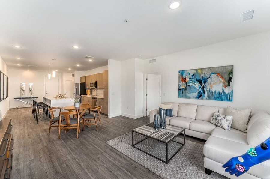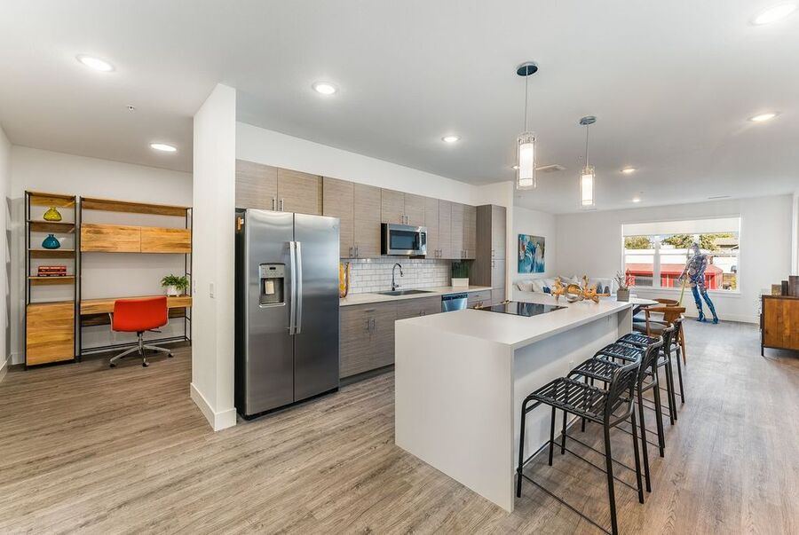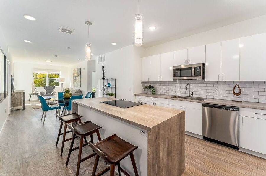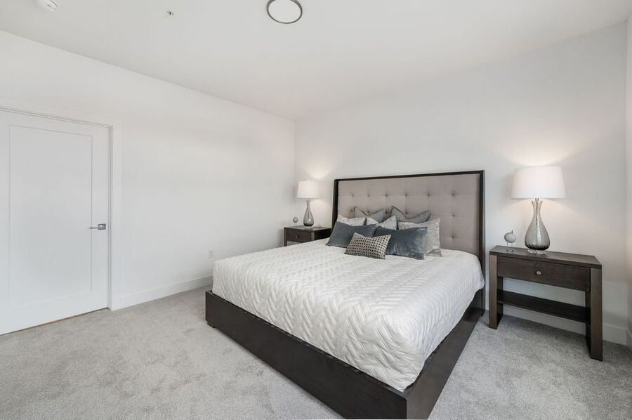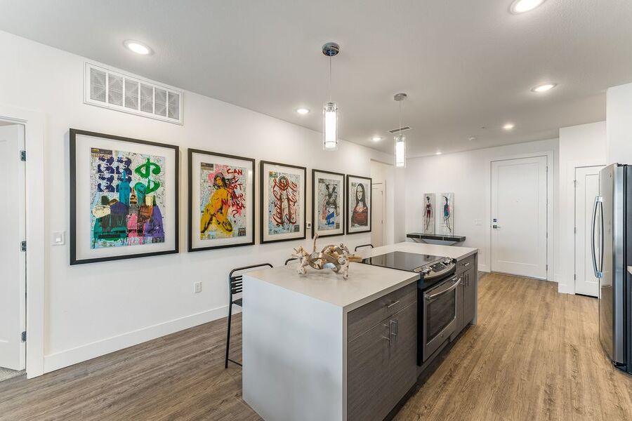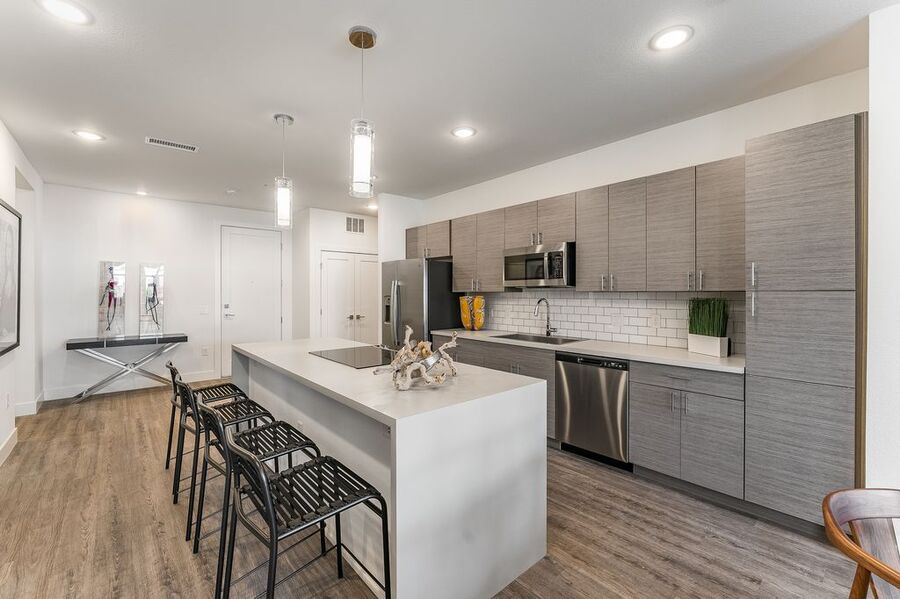 Each apartment is thoughtfully designed with 9' volume ceilings and luxury plank flooring, creating a sophisticated and spacious feel. The interiors include spacious walk-in closets with upgraded textured carpet, USB/Data ports for seamless connectivity, LED lighting, decorator roller shades, and overhead lighting in bedrooms. The modern touch is enhanced with rocket light switches for effortless functionality. The kitchen is a chef's dream, boasting stainless steel appliances, including a side-by-side counter-depth refrigerator, multicycle dishwasher, and Urbana cabinetry. Full tile backsplashes and large island seating with decorative glass pendant lights add a stylish flair, making it perfect for entertaining. Bathrooms are designed with elegance and comfort in mind, featuring spacious showers, designer tiles on both floors and walls, and sleek hard surface countertops.