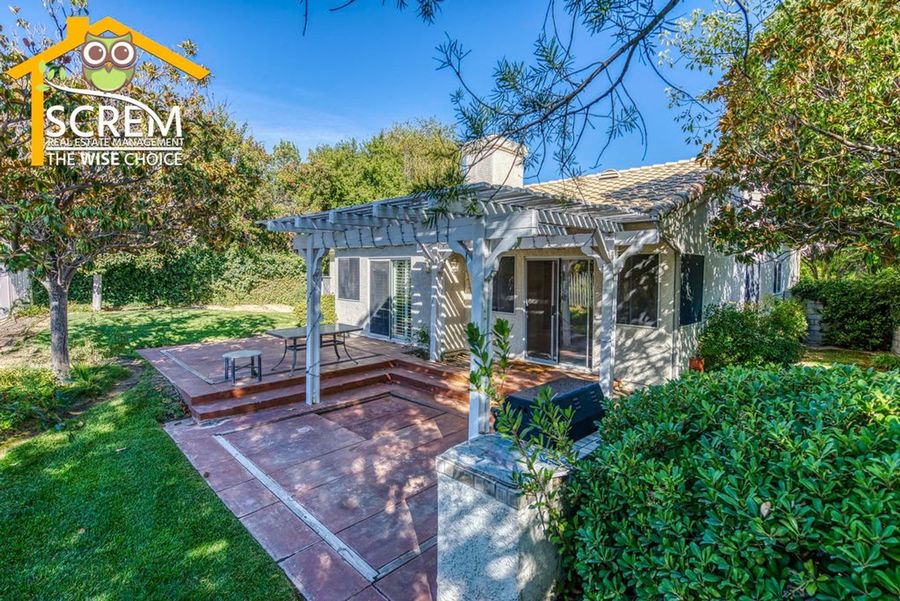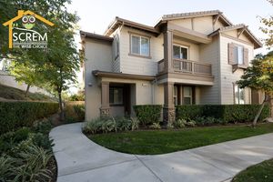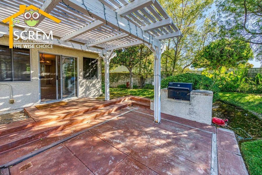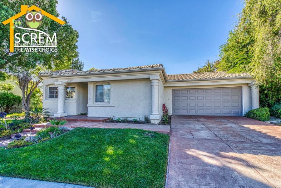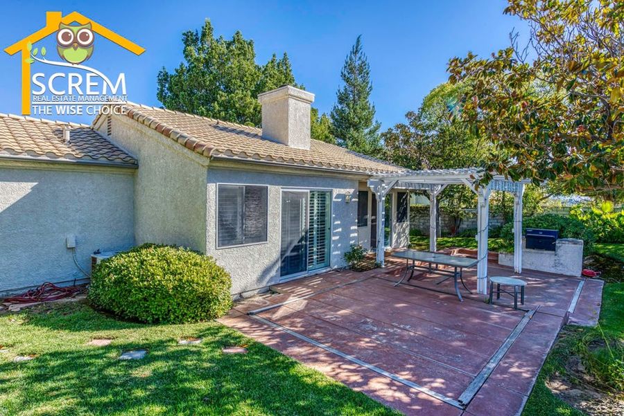 This beautiful single-story two-bedroom home in Stevenson Ranch boasts a stunning view. As you enter, you're welcomed by a tiled entryway that leads to an open living room and dining area featuring elegant designer touches, including decorative columns and ceramic tile flooring. The dining area is adorned with a stylish light fixture. The living room is enhanced by a cozy gas fireplace, recessed lighting, and a sliding glass door that opens to the backyard. The private backyard offers breathtaking city and mountain views, a spacious covered patio, a built-in barbecue, and a beautifully landscaped lawn. The kitchen is equipped with elegant kitchen cabinets, stone countertops, and stainless steel appliances, including an electric stove, single oven, dishwasher, microwave, and refrigerator. The guest bedroom features an open closet area with built-in shelves, a ceiling fan, and laminate flooring. The full guest bathroom includes a designer vanity with a granite countertop. The primary bedroom also has laminate flooring, mirrored closet doors, plantation shutters, and a sliding glass door leading to the backyard. The attached primary bathroom offers double sinks for added convenience. Additional features include a laundry closet with a washer and dryer, and an attached two-car garage. This home is ideally located near the 5 Freeway, shopping centers, restaurants, and a golf course. *Owner may consider a small pet.