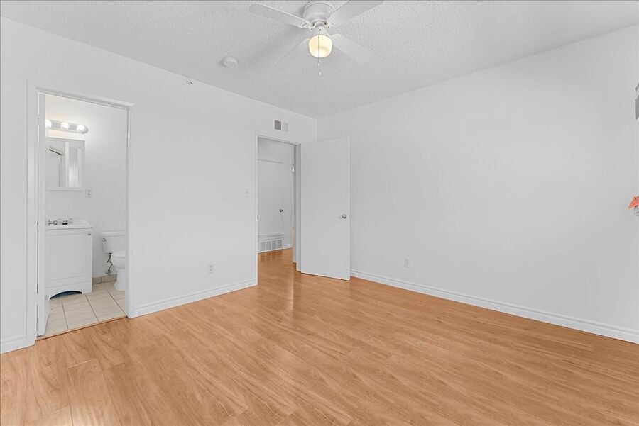 The expansive U-shaped kitchen provides abundant countertop space, ample cabinetry, and stainless steel appliances, making it both functional and stylish for cooking and hosting. All three bedrooms are tucked away from the main living area for added privacy, with a hallway bathroom conveniently located between them. The spacious bedrooms feature built-in closets and ceiling fans, while the primary suite offers the added comfort of an en-suite bathroom and a private balcony.