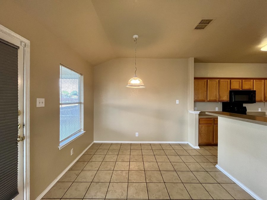 Ceramic tile and vinyl flooring add a modern touch while offering easy maintenance. A separate dining room provides an ideal setting for gatherings, celebrations, or quiet dinners at home. The home is also equipped with an alarm system, HVAC with a programmable thermostat for year-round comfort, and plumbing ready for a water softener. The kitchen is both functional and inviting, featuring a breakfast bar, glass electric stove, dishwasher, microwave, and a spacious pantry, making meal prep and storage simple and convenient.