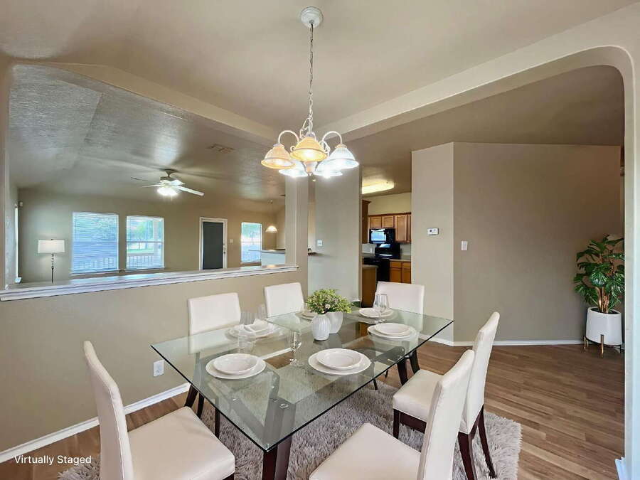 Additional highlights include washer and dryer hookups in the dedicated laundry room and a two-car garage with door opener for added convenience. Step outside to enjoy the covered patio and fully fenced backyard with privacy fence and gutters, perfect for outdoor dining, relaxing evenings, or hosting guests.