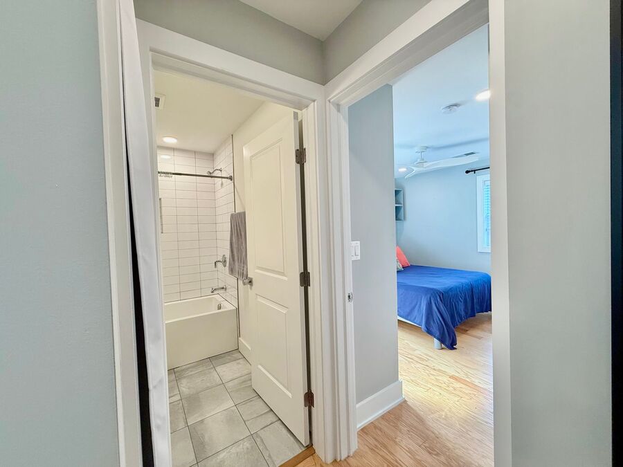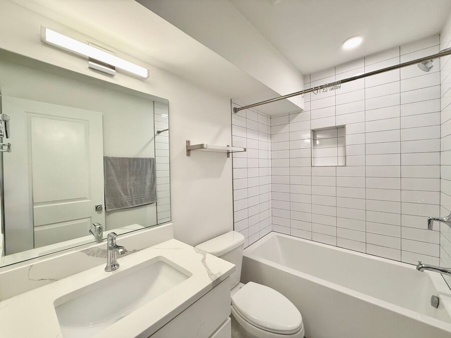 Full bathroom in hallway with sleek and modern finishes