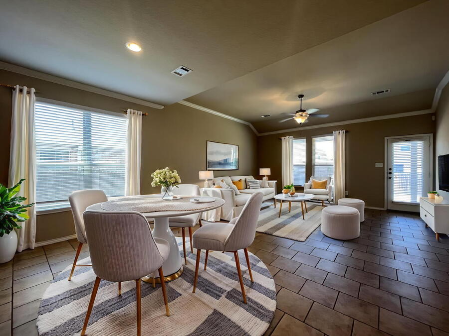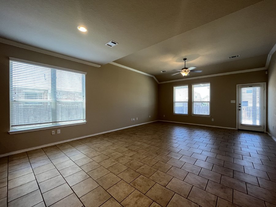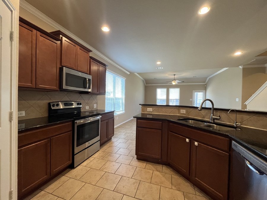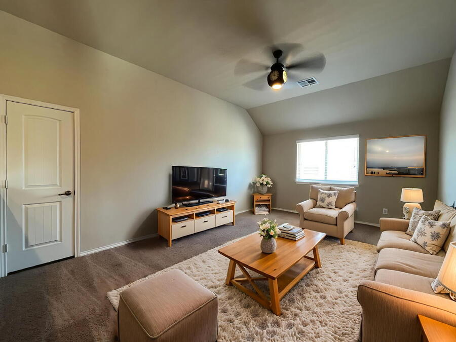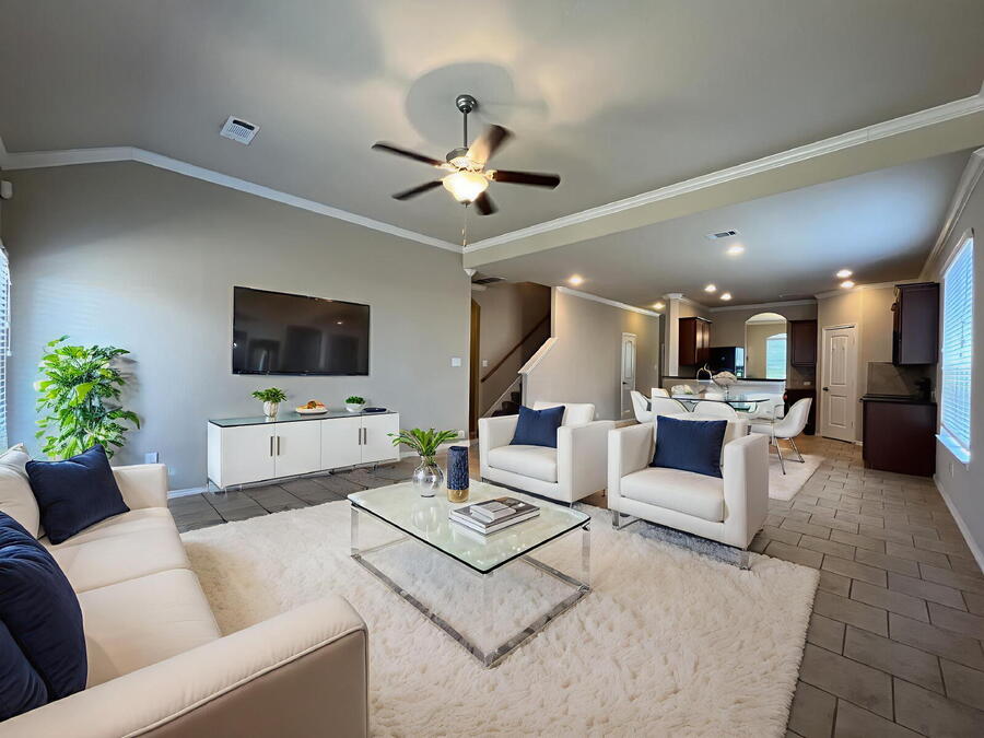 Welcome to this well-maintained 4-bedroom, 2.5-bath home offers a spacious open floor plan with two living areas, two dining spaces, high ceilings and a combination of carpet and ceramic tile flooring throughout. The kitchen is fully equipped with an electric stove, refrigerator, microwave, dishwasher, pantry, breakfast bar and a reverse osmosis drinking water system perfect for both everyday cooking and entertaining.