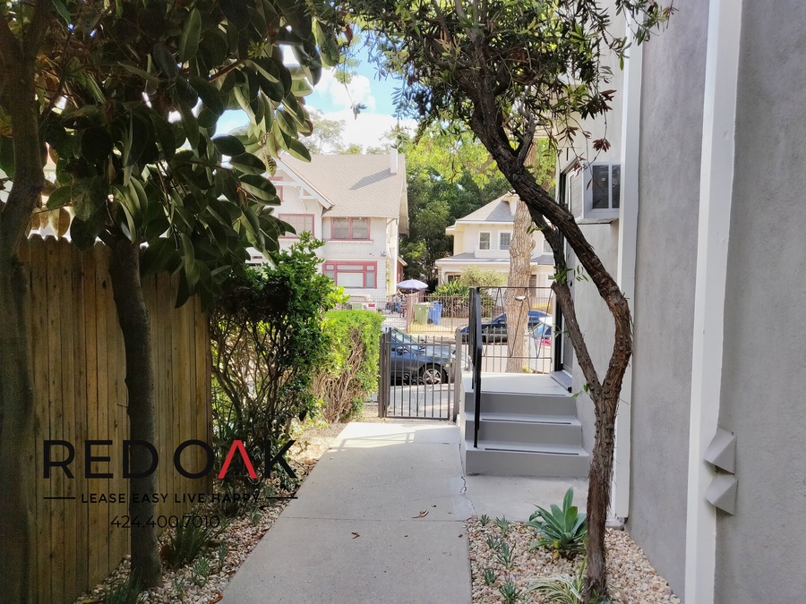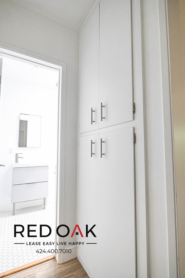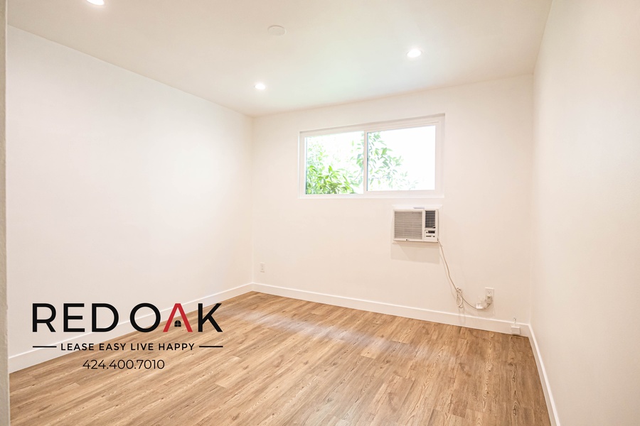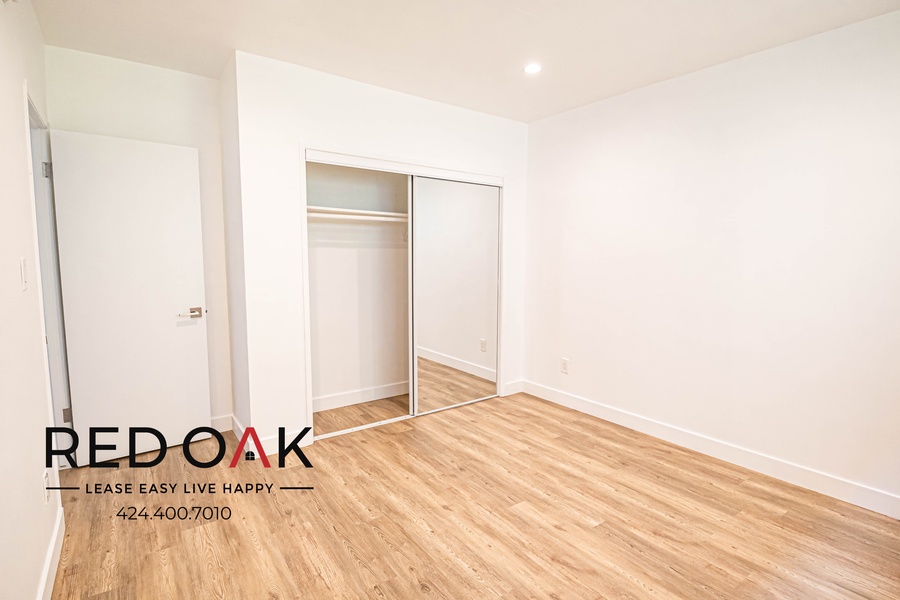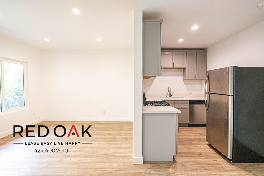 This fantastic one-bedroom has it all! Step into the incredibly spacious living room area featuring all NEW hardwood flooring, a gas furnace keeping warm and cozy on those cold winter days, large windows letting in tons of natural sunlight, and modern recessed lighting. Connected, you'll find a beautiful fully stocked kitchen, complete with NEW Stainless Steel Appliances (refrigerator, gas range/oven, and dishwasher), top-of-the-line quartz countertops, and tile backsplash and custom hardwood cabinetry for additional storage space! You'll love the generously sized bedroom, featuring a window with tons of natural lighting, NEW hardwood flooring, mirrored sliding door closets with custom hardwood built-ins, custom recessed lighting, and a wall-mounted AC unit to help keep you cool and comfortable in the LA heat! Don't miss the completely updated bathroom, built with form and function in mind to include an oversized vanity with granite countertop, modern hexagonal tiled flooring, and soaking tub with a custom tile backsplash. Don't forget about the PARKING space and shared laundry! This unit has all you could ever ask for!