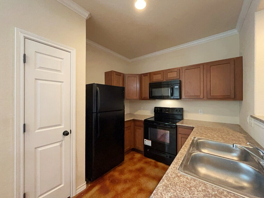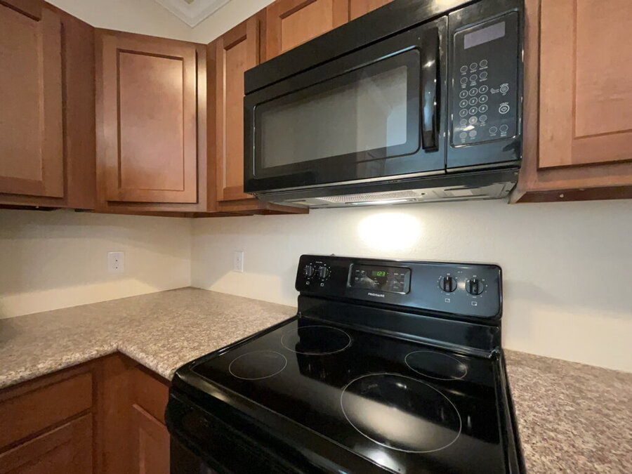 The kitchen is thoughtfully equipped with solid countertops, an electric stove, microwave, refrigerator, dishwasher and a generous pantry. The eat-in kitchen layout creates a functional space for everyday meals and casual gatherings.