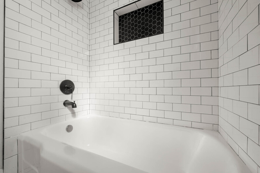 ~ Spa-Inspired Bathroom: Vanity, well-lit mirror, and a luxurious soaking tub/shower.