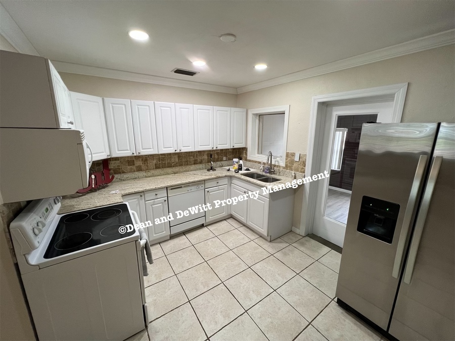 Kitchen has granite countertops and a stainless steel refrigerator.