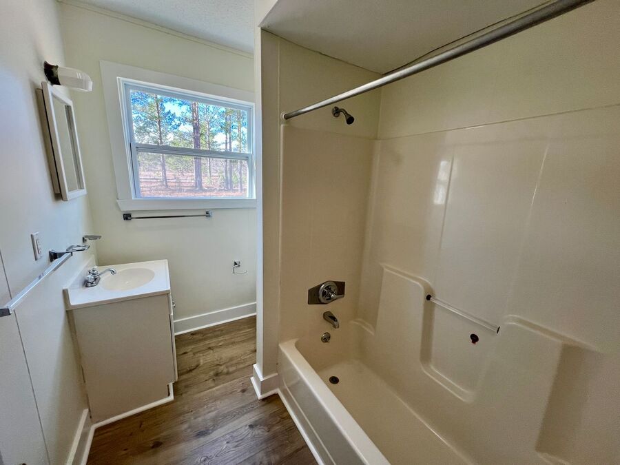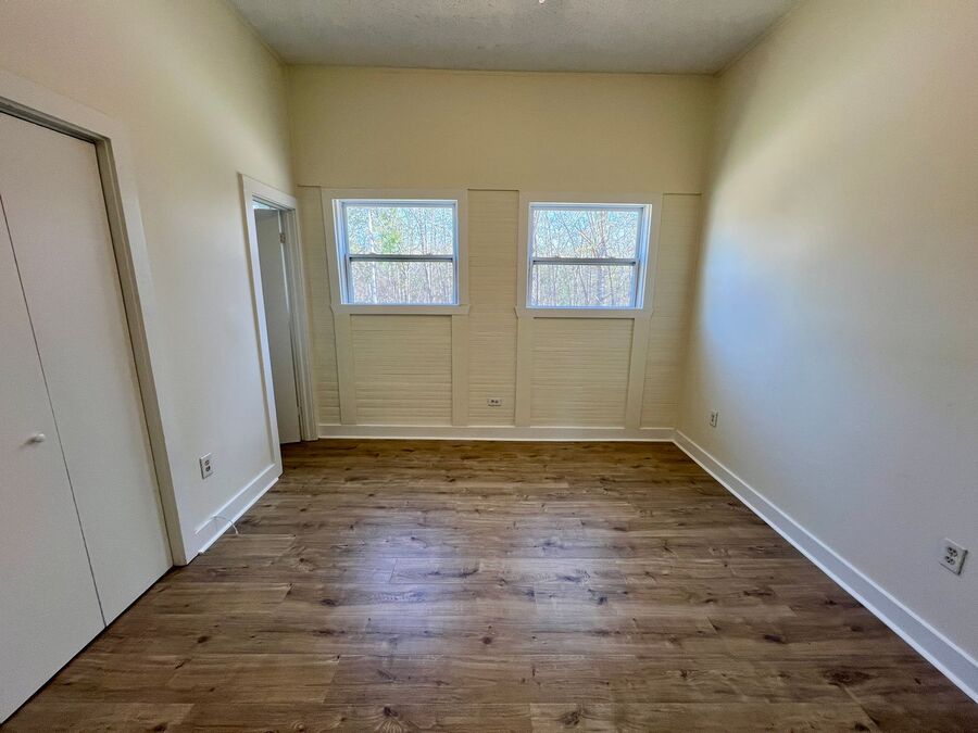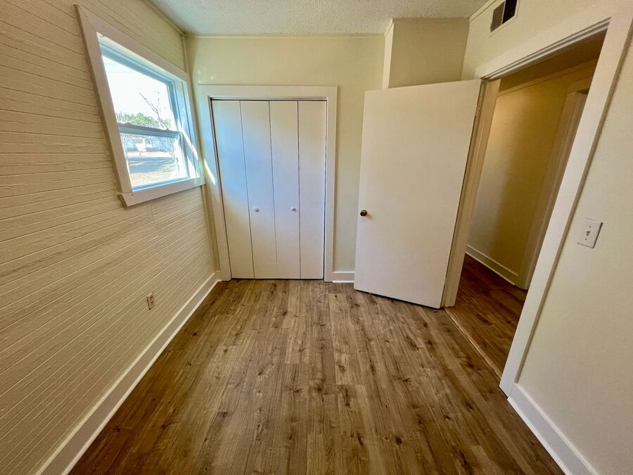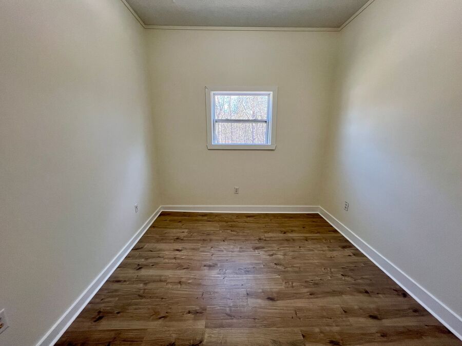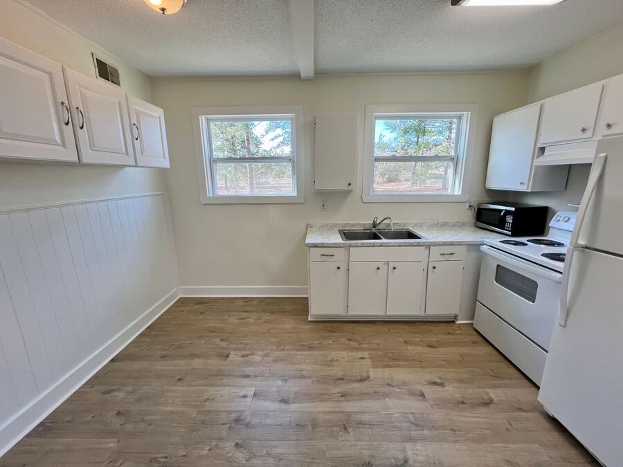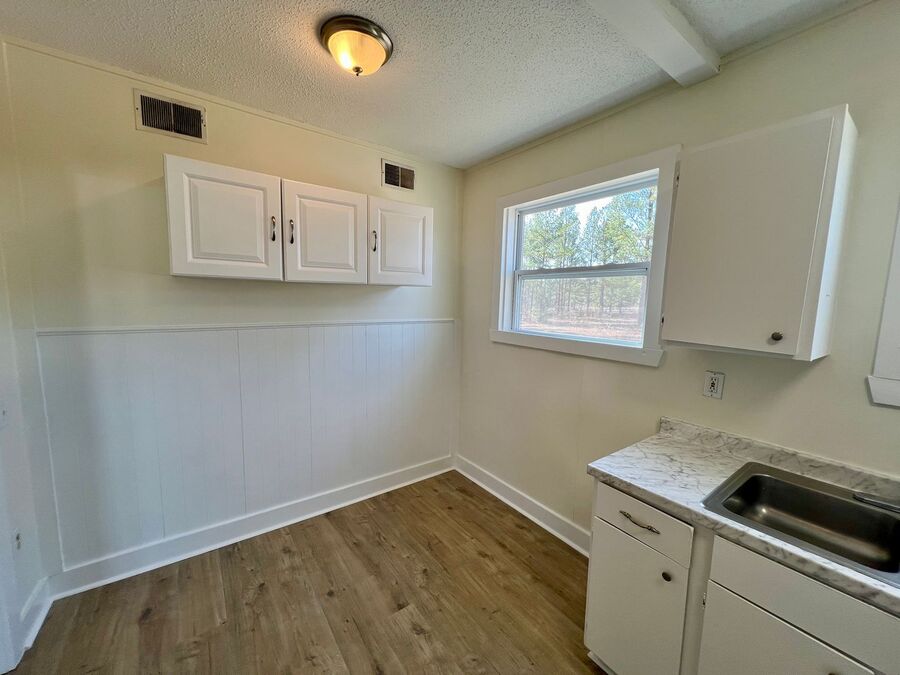 Inside, you’ll find durable wood-look flooring throughout and neutral paint tones that complement any style. The living space is filled with natural light, creating a warm and welcoming atmosphere. The kitchen features white cabinetry, ample storage, updated countertops, and windows overlooking the yard, making it both bright and functional.