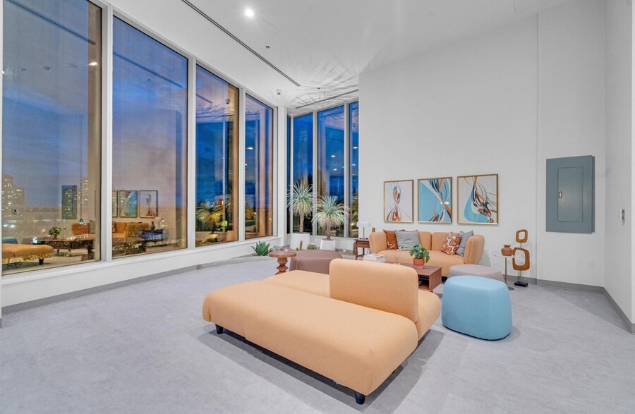 -Modern interior with large floor-to-ceiling windows, flooding the space with natural light