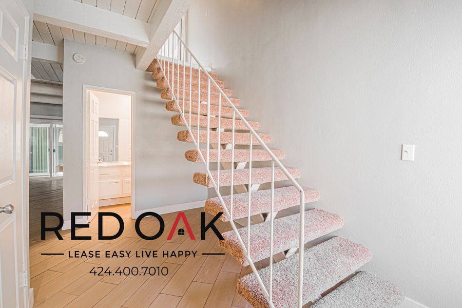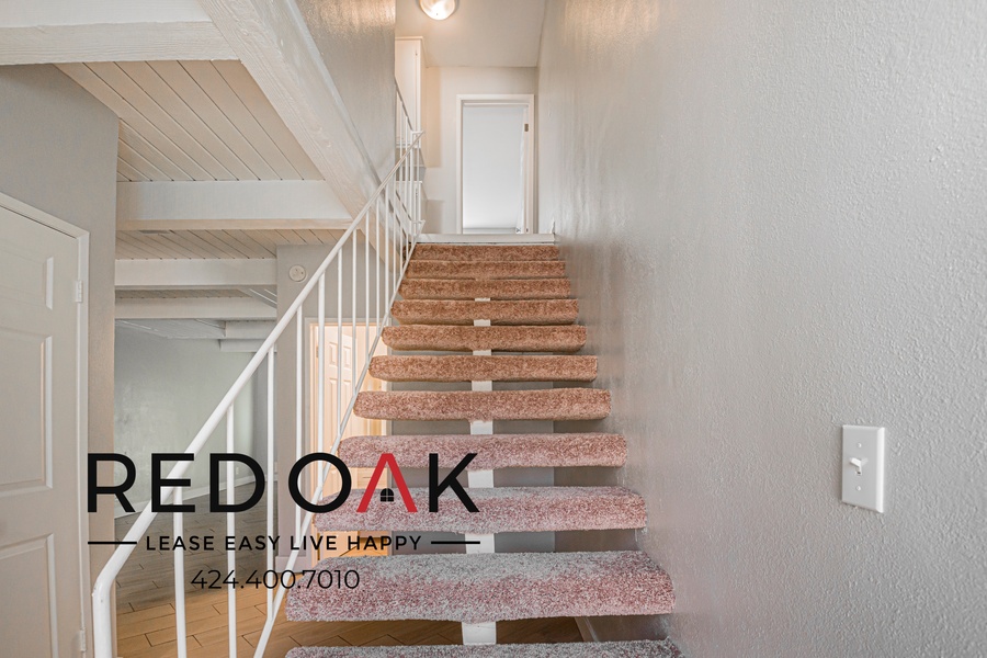 ~ Plush Carpets: Soft carpeting covers the stairs.