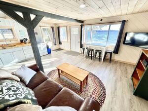 - Amenities include a private beachside firepit, propane grill, kayaks with paddles and life jackets, and a stocked bathroom with fresh towels and complimentary toiletries.