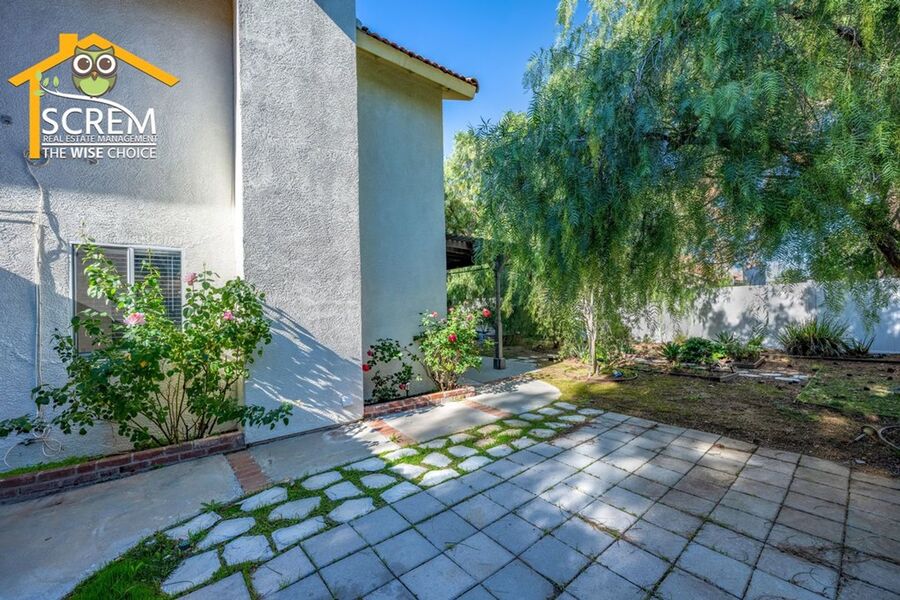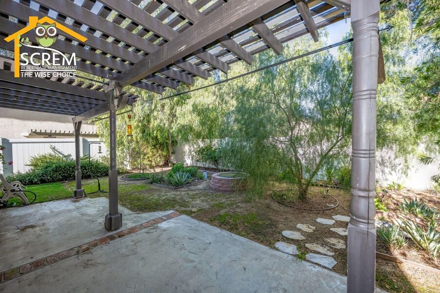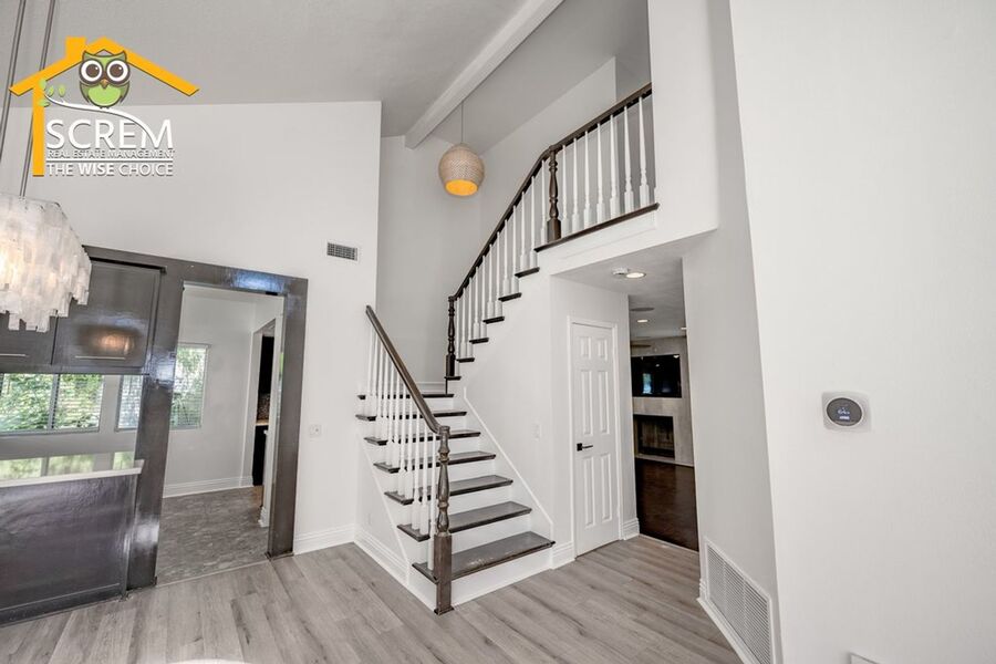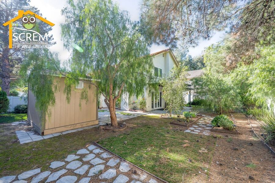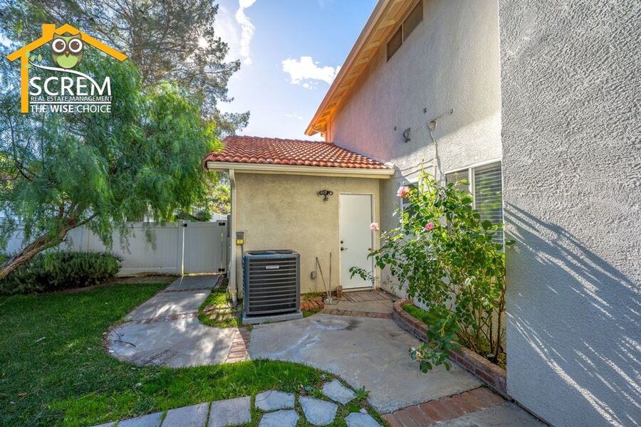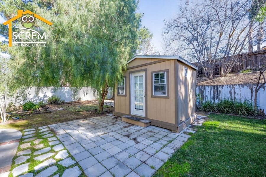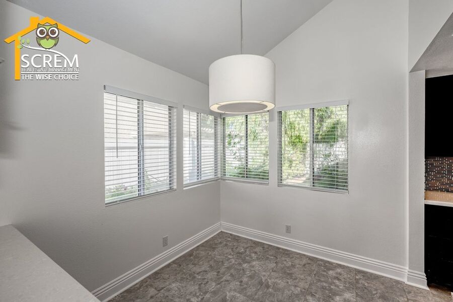 This beautiful three-bedroom, 2.5-bath home offers a bright, open layout and energy-efficient solar. Upon entry, you’re welcomed into a light-filled living and dining area featuring vaulted ceilings and durable vinyl plank flooring. The kitchen is both stylish and functional, complete with stainless steel appliances, recessed lighting, a farmhouse sink, and a breakfast bar with a built-in microwave and wine fridge, perfect for everyday living and entertaining. Just off the kitchen is a cozy family room with a fireplace, mounted TV, surround-sound speakers, and French doors that open onto a private wraparound backyard with mature landscaping and a spacious shed, ideal for an office, hobby space, or special projects. A convenient half bath is located downstairs for guests. Upstairs, the primary suite boasts vaulted ceilings, recessed lighting, a ceiling fan, and three mirrored closets, along with an updated ensuite bathroom featuring dual sinks and a walk-in shower. Two additional bedrooms also offer vaulted ceilings and share a full bathroom with dual sinks. Additional highlights include a fresh paint, a three-car garage with a full-size washer and dryer, an HVAC system equipped with a UV light to help eliminate bacteria, and solar panels for added energy efficiency. Enjoy the HOA pool and spa. Conveniently close to shopping and restaurants. *Owner may consider a pet.
