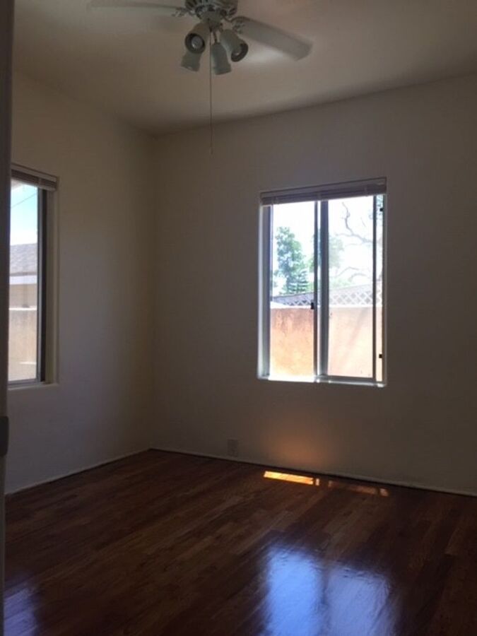 Spanish style 1Br/1Ba duplex. Refinished Wood floors,freshly painted, large walk-in-closets in Livingroom & Bedroom ,Unit has separate dining room, lots of storage, gas stove+fridge, & huge back yard area, One single car garage for storage, shops, restaurants. & 805/15 Freeways. 12 month lease minimum. $35 application fee per adult. Please do not disturb other residents. Sorry no pets, no co-signors.