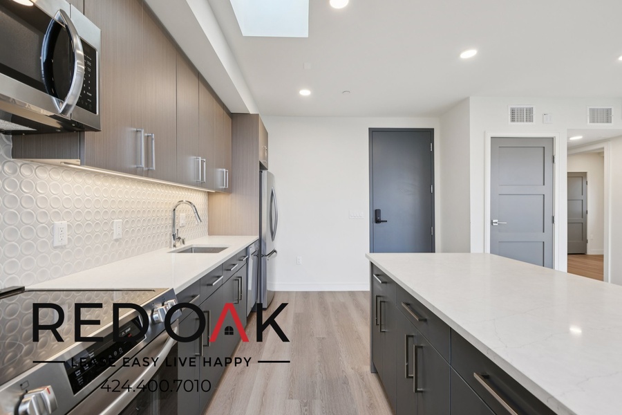 ~ Modern Kitchen: Hardwood cabinets, quartz counters, breakfast island, and stainless steel appliances.