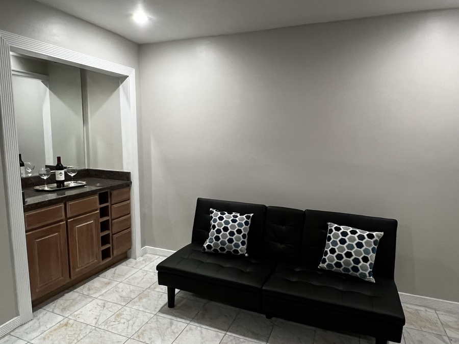 Fully furnished 1 bedroom with a full-size bed, cozy sofa, and TV