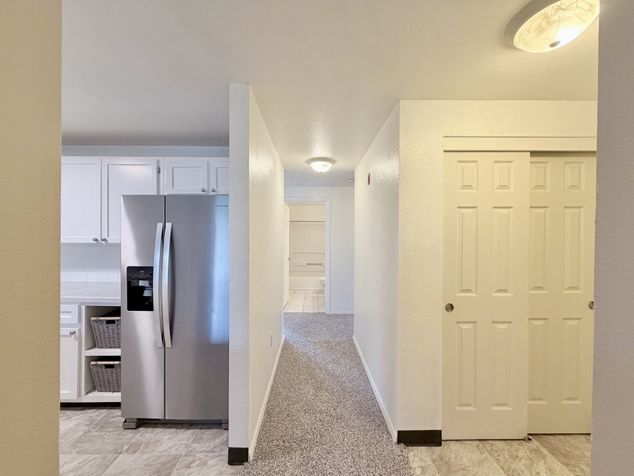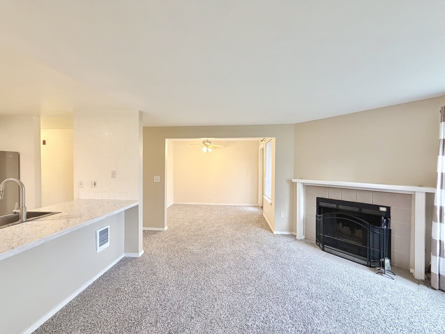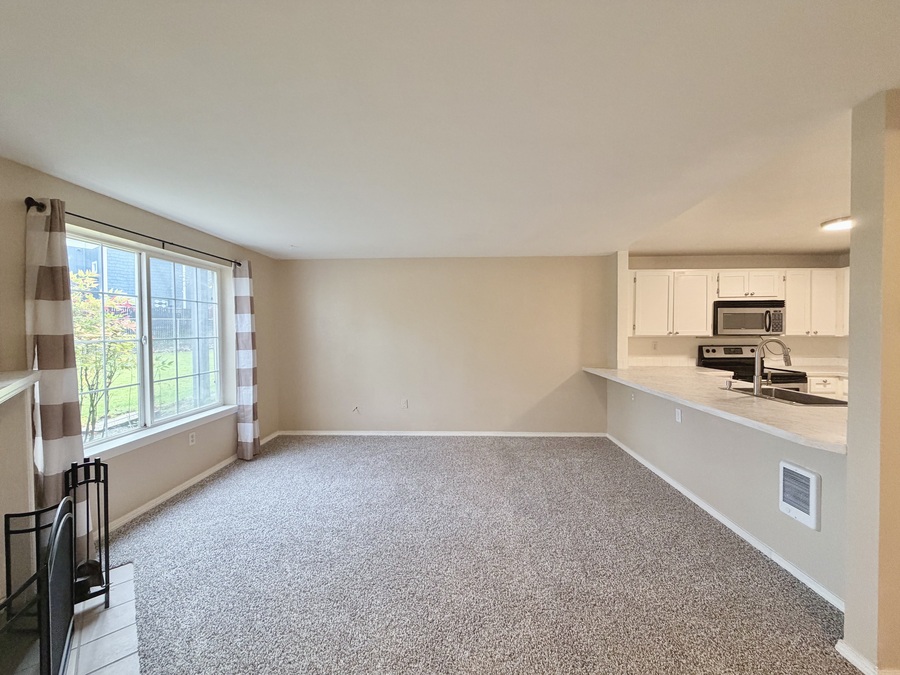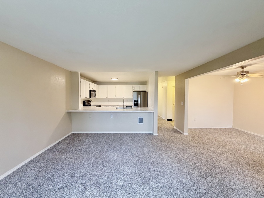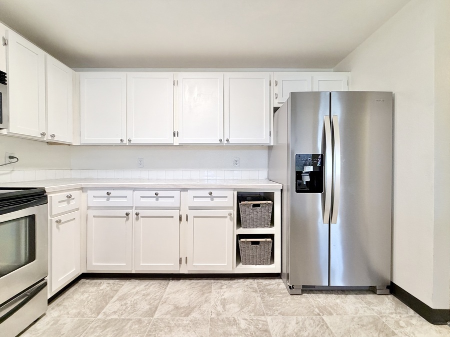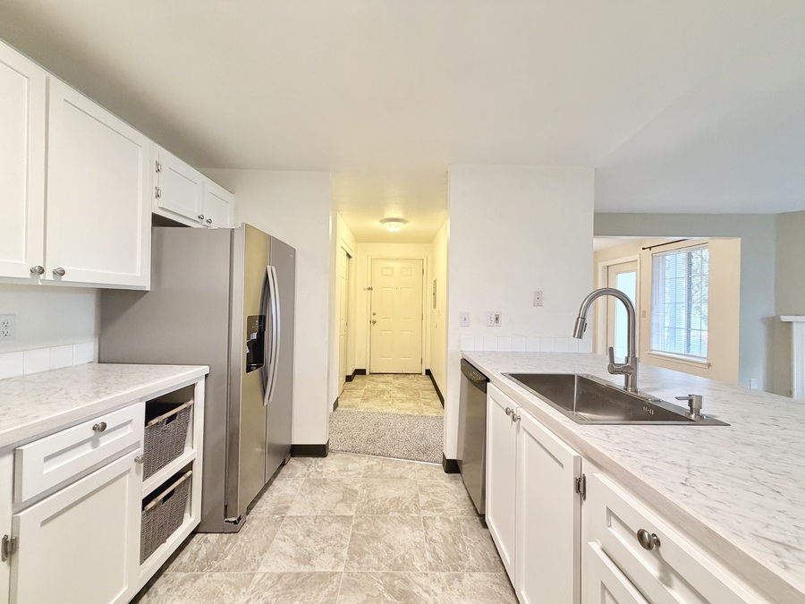 The modern kitchen shines with crisp white cabinetry, stainless-steel appliances, and a breakfast bar that seamlessly connects the dining area and open-concept living room—perfect for meals, morning coffee ☕, or hosting friends. Please note: there is no water line connection for the refrigerator.