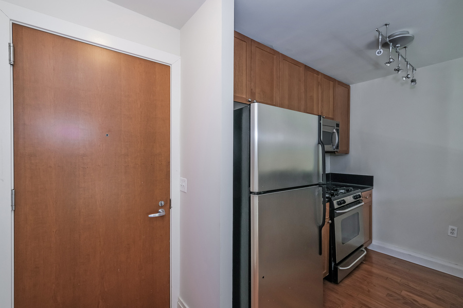 Spacious, expansive and efficient Studio Condo with tall ceilings and excellent natural light. Efficient kitchen with stainless steel appliances, gas stove and built in microwave and breakfast bar countertop. Open layout allows for several design options and balcony doors to small patio.