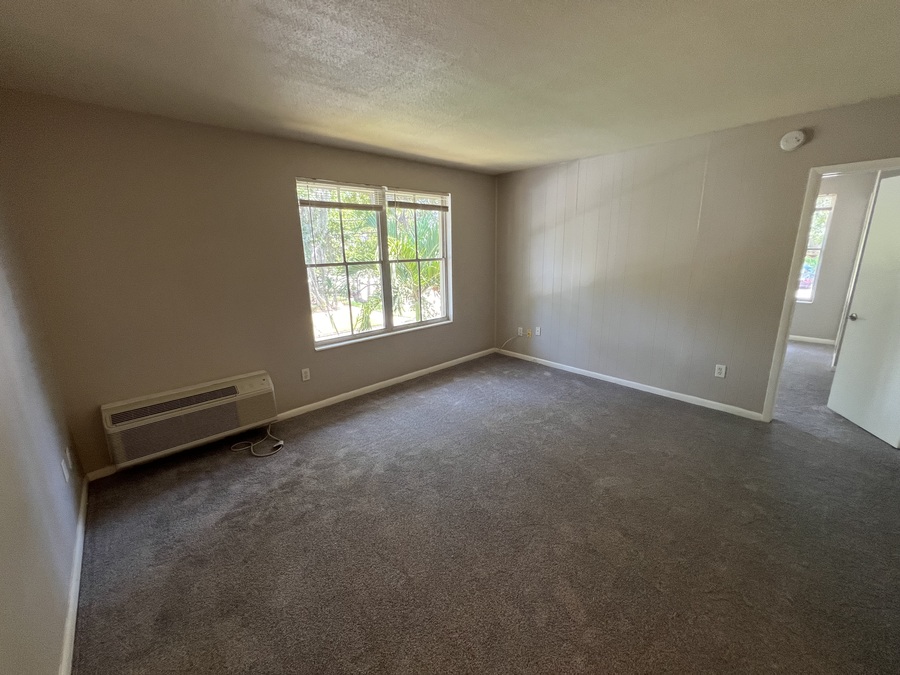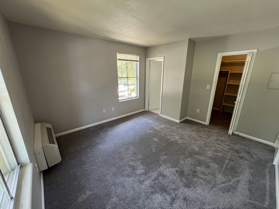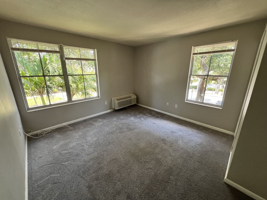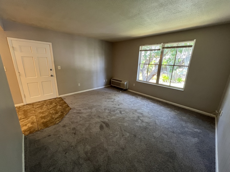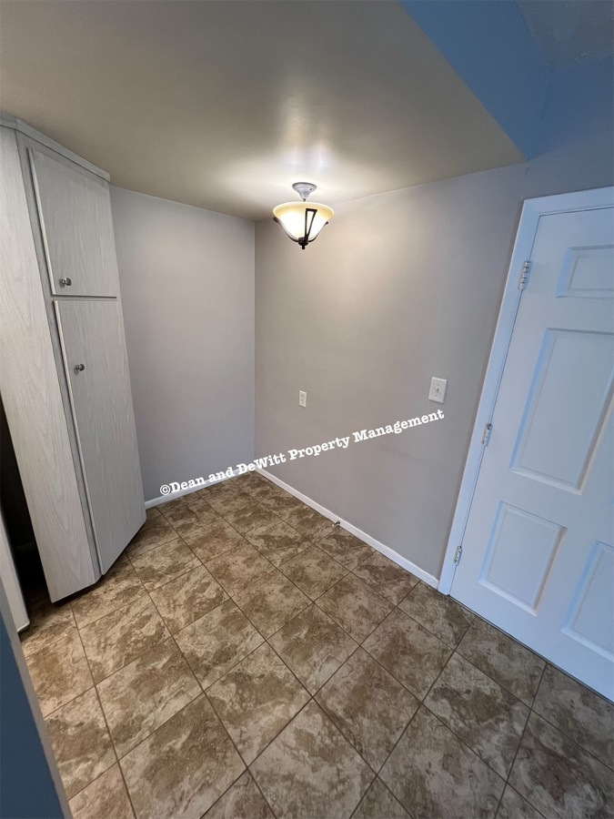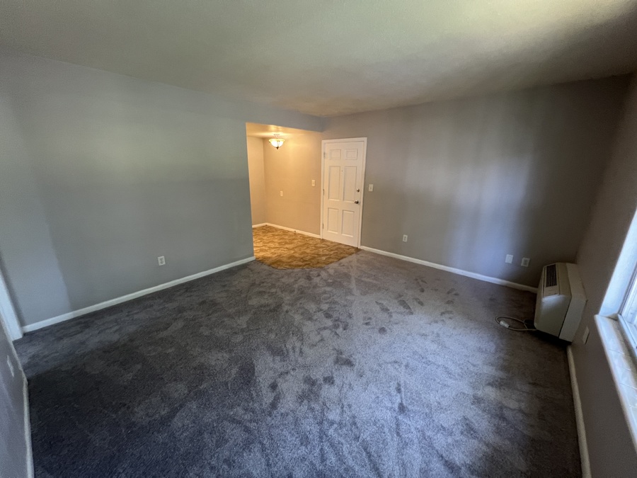 Second floor apartment has neutral carpet or tile throughout