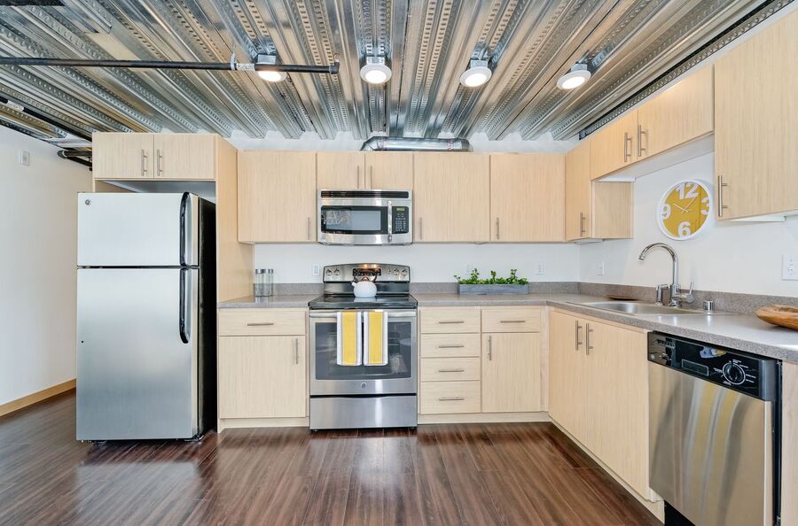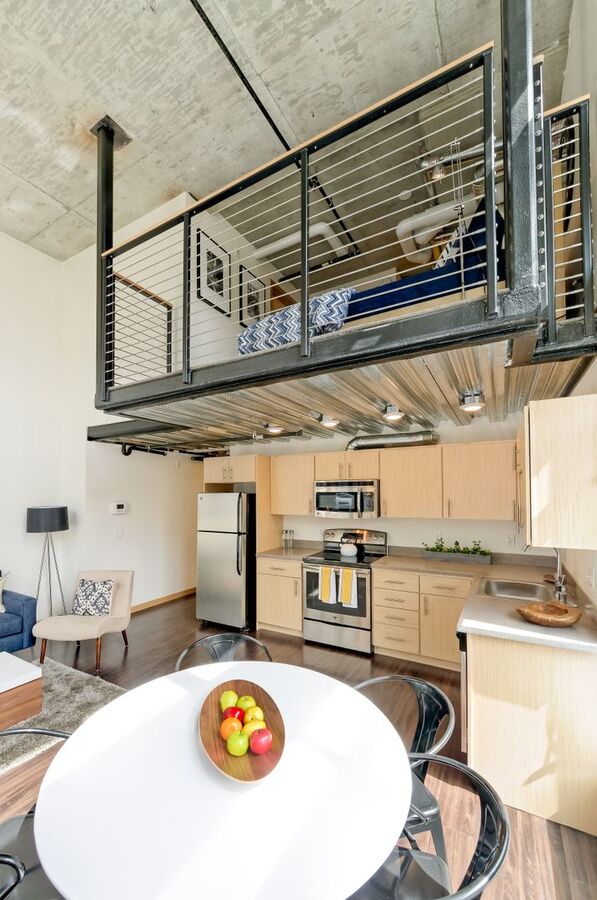 • Open-concept industrial-style studio layout