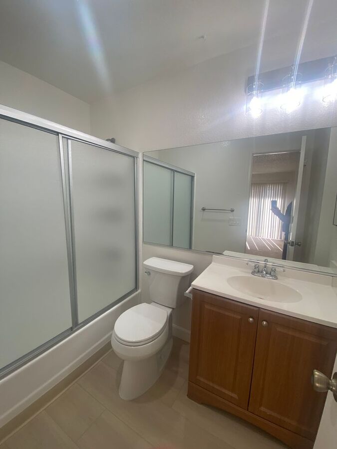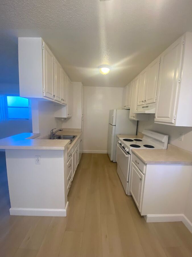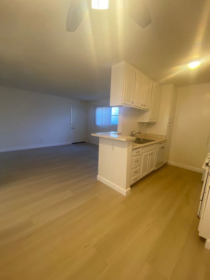 Ground-floor two-bedroom, two-full-bath apartment with fresh paint and brand-new flooring. The unit features a dishwasher, faux fireplace, fenced patio, on-site laundry, and designated parking. Laundry room onsite and one assigned parking space round out this small complex.