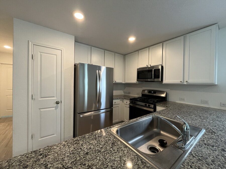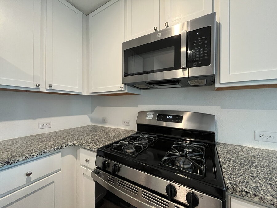 The kitchen is well-appointed with a breakfast bar, dishwasher, microwave, gas stove/range, refrigerator, and solid countertops, perfect for culinary enthusiasts. Washer/dryer hookups add to the convenience.