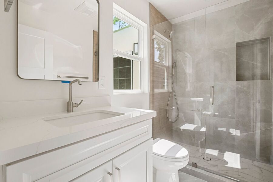 The modern bathroom includes a walk-in shower with a glass door and tile flooring. Numerous windows flood the space with natural light. Residents have access to communal laundry facilities shared with two other units, and the property is pet-friendly!