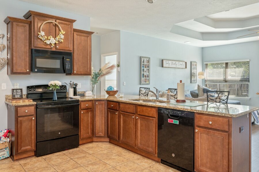 Open-concept kitchen with breakfast bar, granite counters, and ample cabinetry