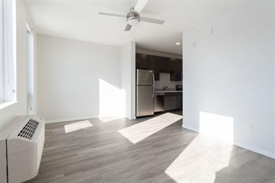 9 ft ceilings & large floor to ceiling windows with roller shades