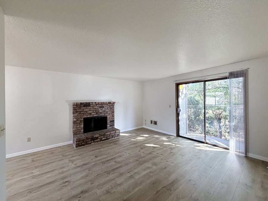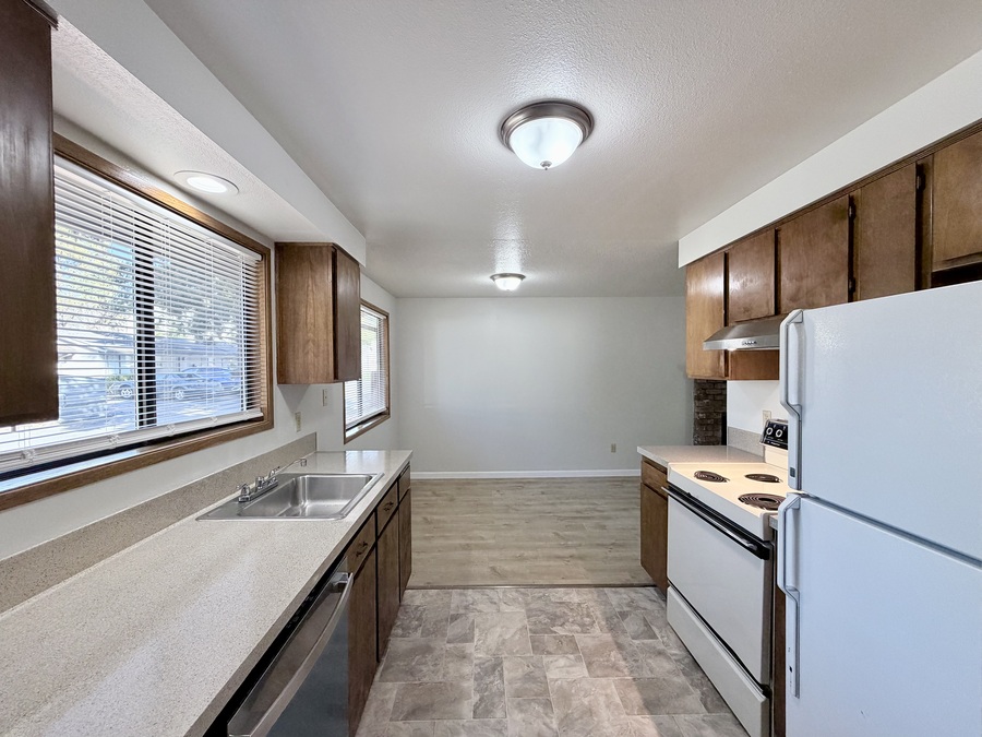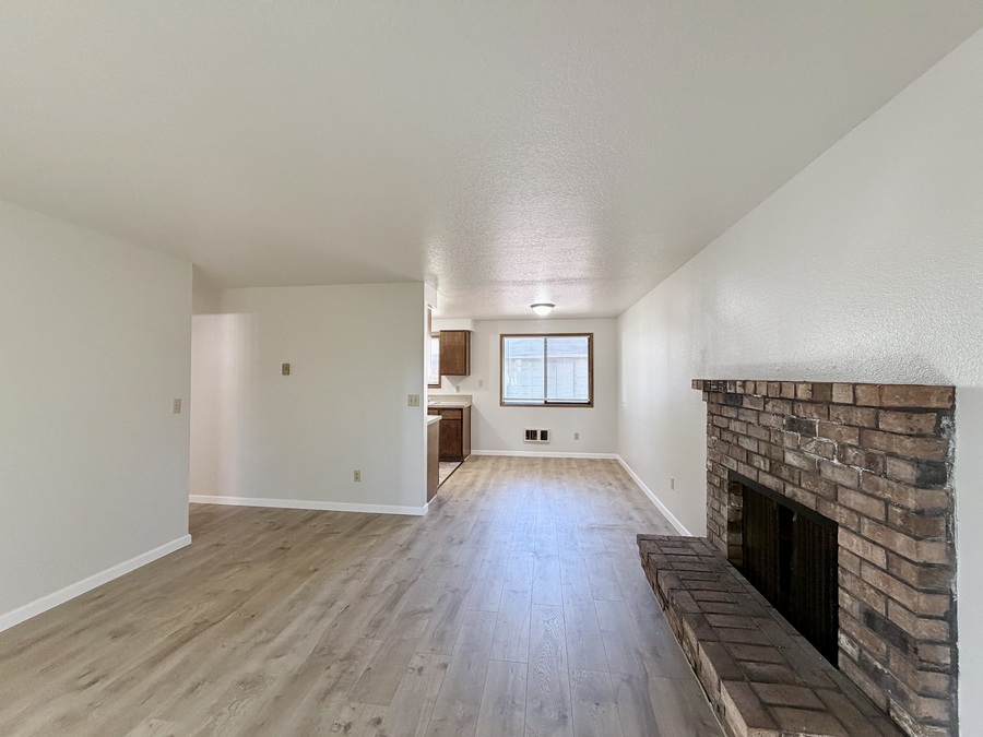 This charming end-unit offers comfort, convenience, and plenty of natural light in a peaceful community setting. Step inside to find fresh LVP flooring throughout and a spacious galley kitchen with abundant cabinetry that flows seamlessly into the bright dining area. The open layout continues into the living room, featuring a decorative fireplace and access to your private patio—complete with a storage closet and shelving.