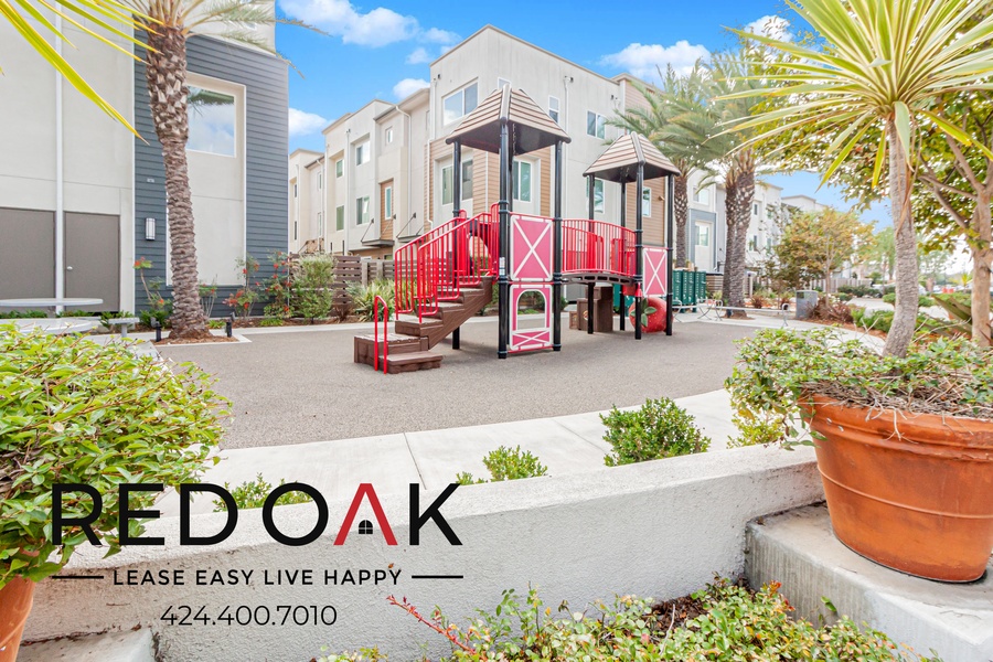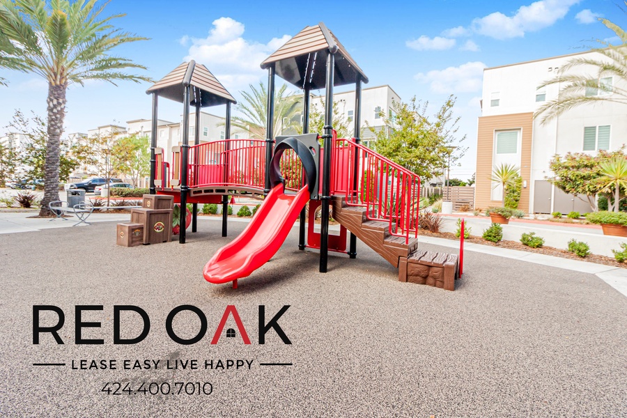 ~ Community Playground: Outdoor space with a slide and fun structures for kids.