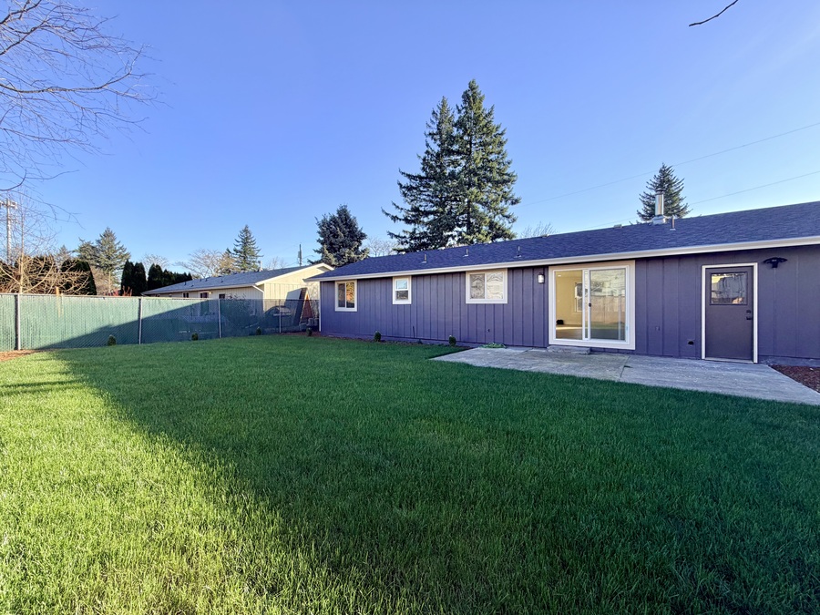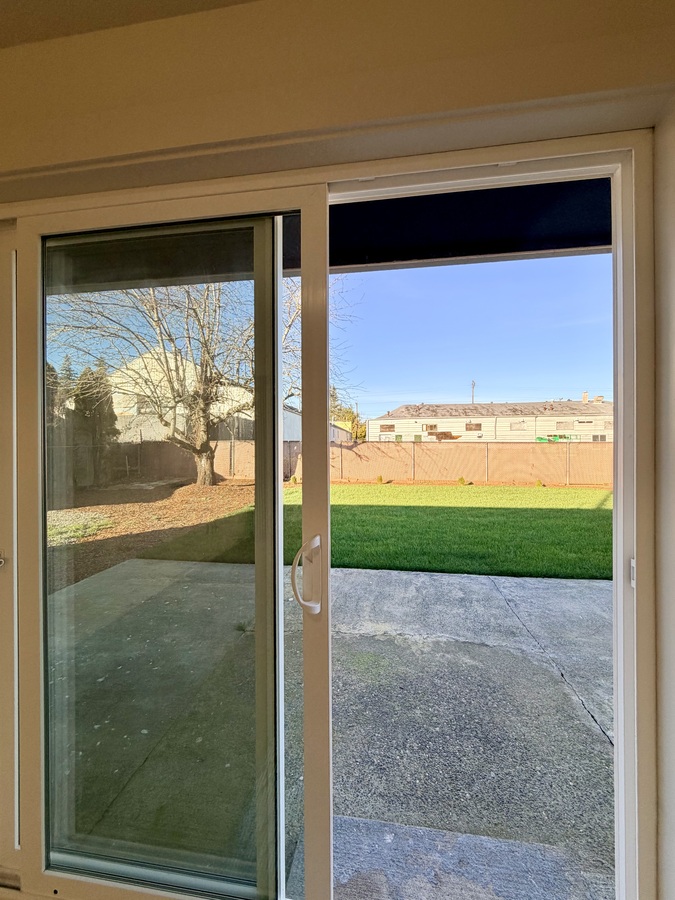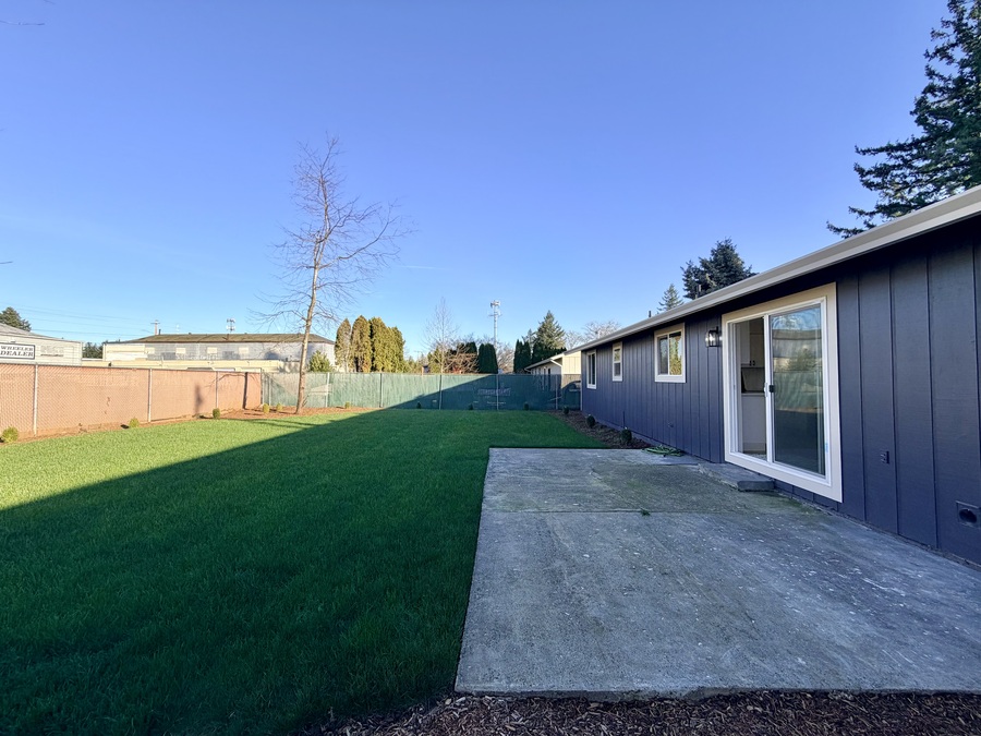 The dining area connects seamlessly to the attached two-car garage, complete with a washer and dryer (as-is), and opens through a sliding glass door to a spacious, fully fenced backyard. Enjoy a concrete patio, fresh landscaping, and plenty of room to relax or entertain outdoors.