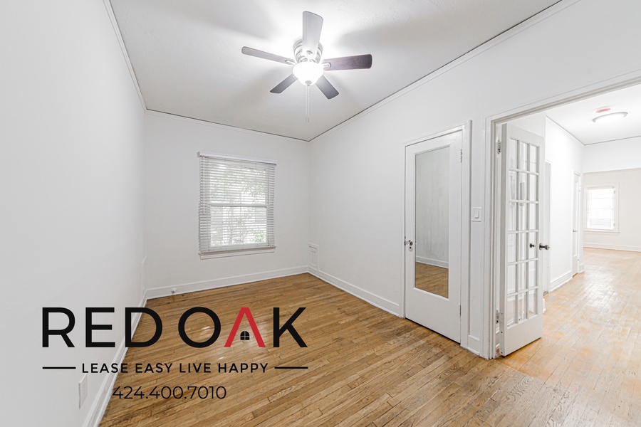 ~ Peaceful Retreat: Bright bedroom with lovely door, large window, ceiling fan, and mirrored closet.