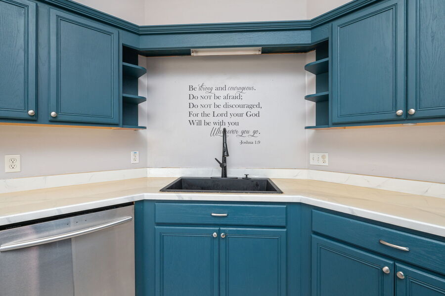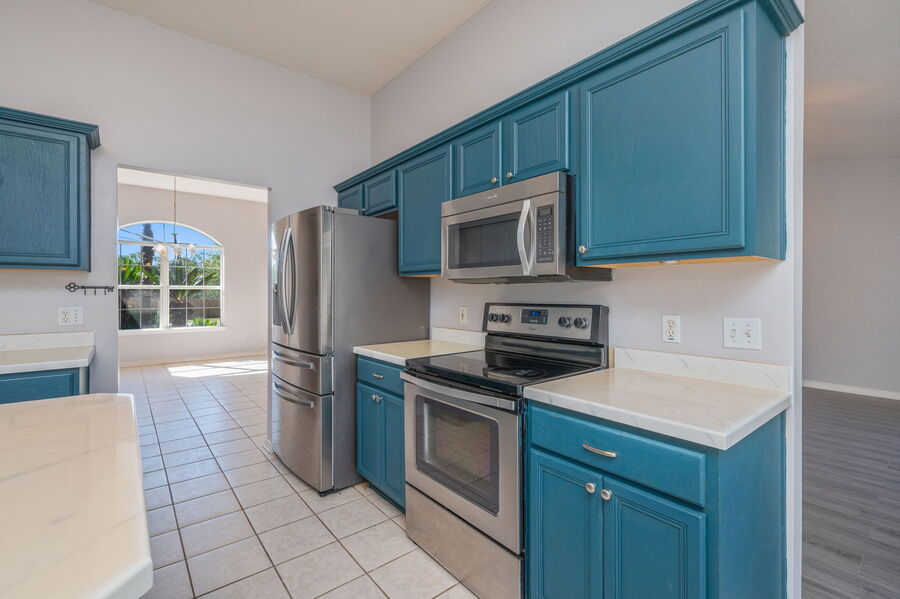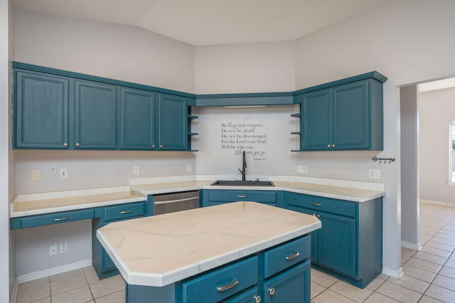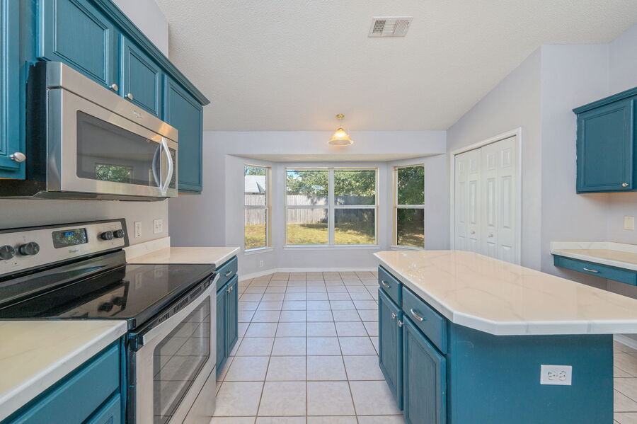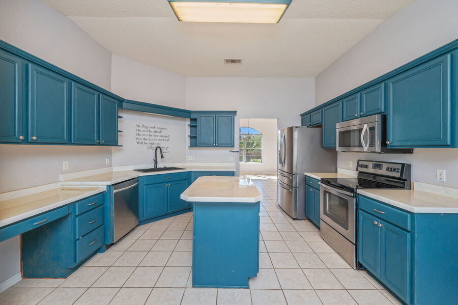 The kitchen is a standout feature, offering stainless steel appliances including a built-in microwave, dishwasher, glass-top stove, and French-door refrigerator. A large kitchen island provides additional workspace and serves as the perfect gathering spot.