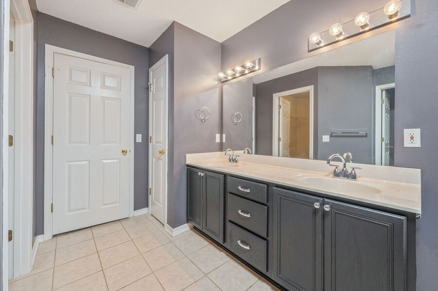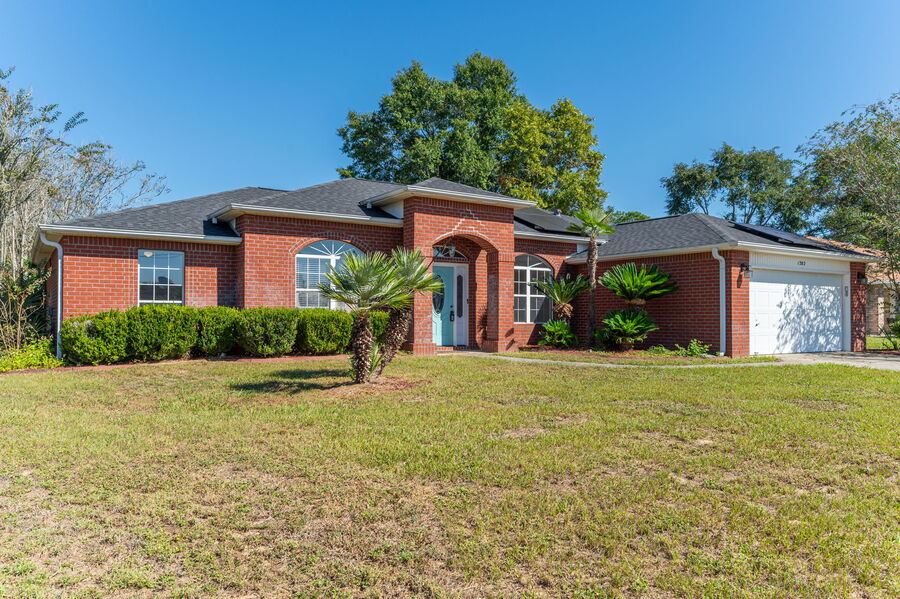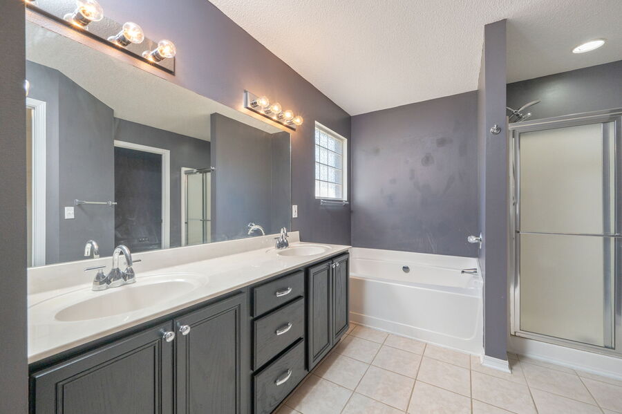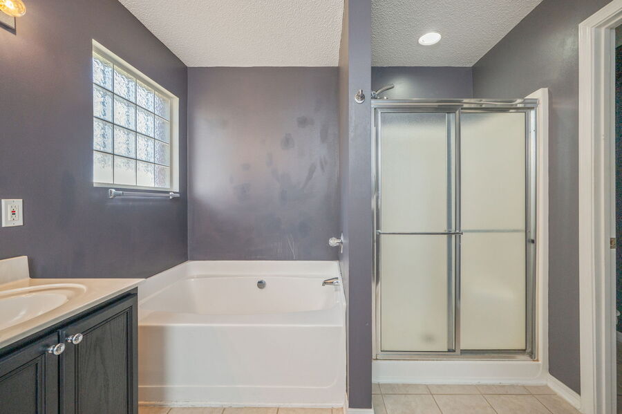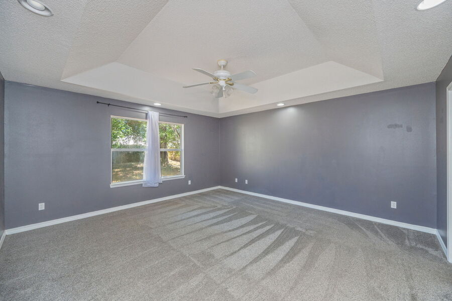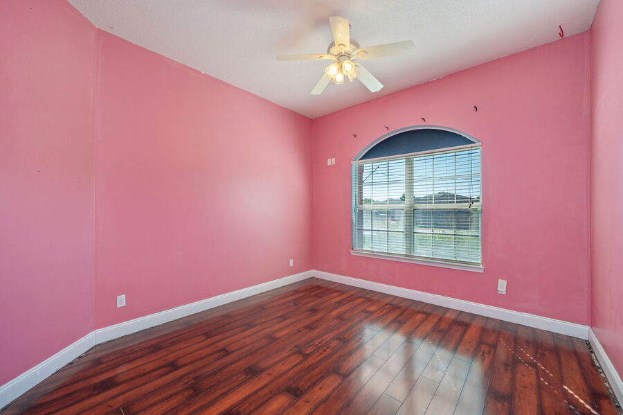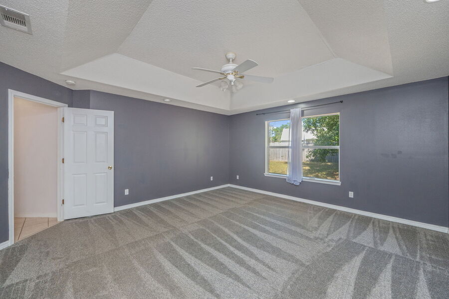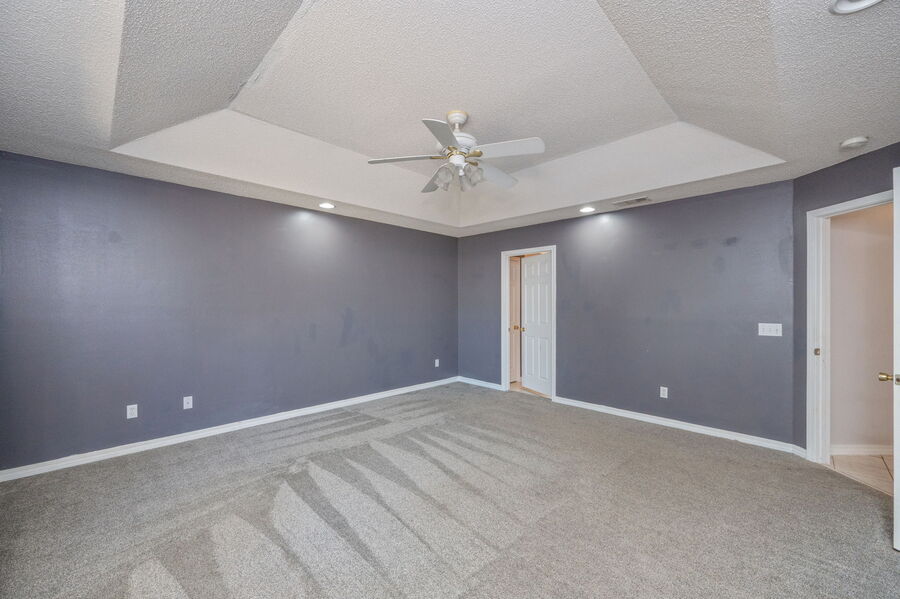The split floor plan ensures privacy, with the primary suite featuring a trey ceiling, walk-in closet, and a luxurious bathroom complete with a garden tub, separate shower, and double vanities. Each of the three additional bedrooms includes wood flooring and ceiling fans.
