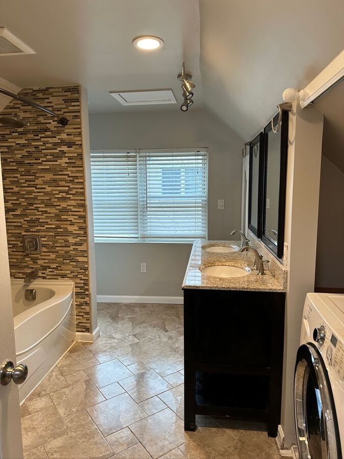 Second-level master suite includes: Dual-sink vanity, Jacuzzi-tub and front-load Washer & Dryer.